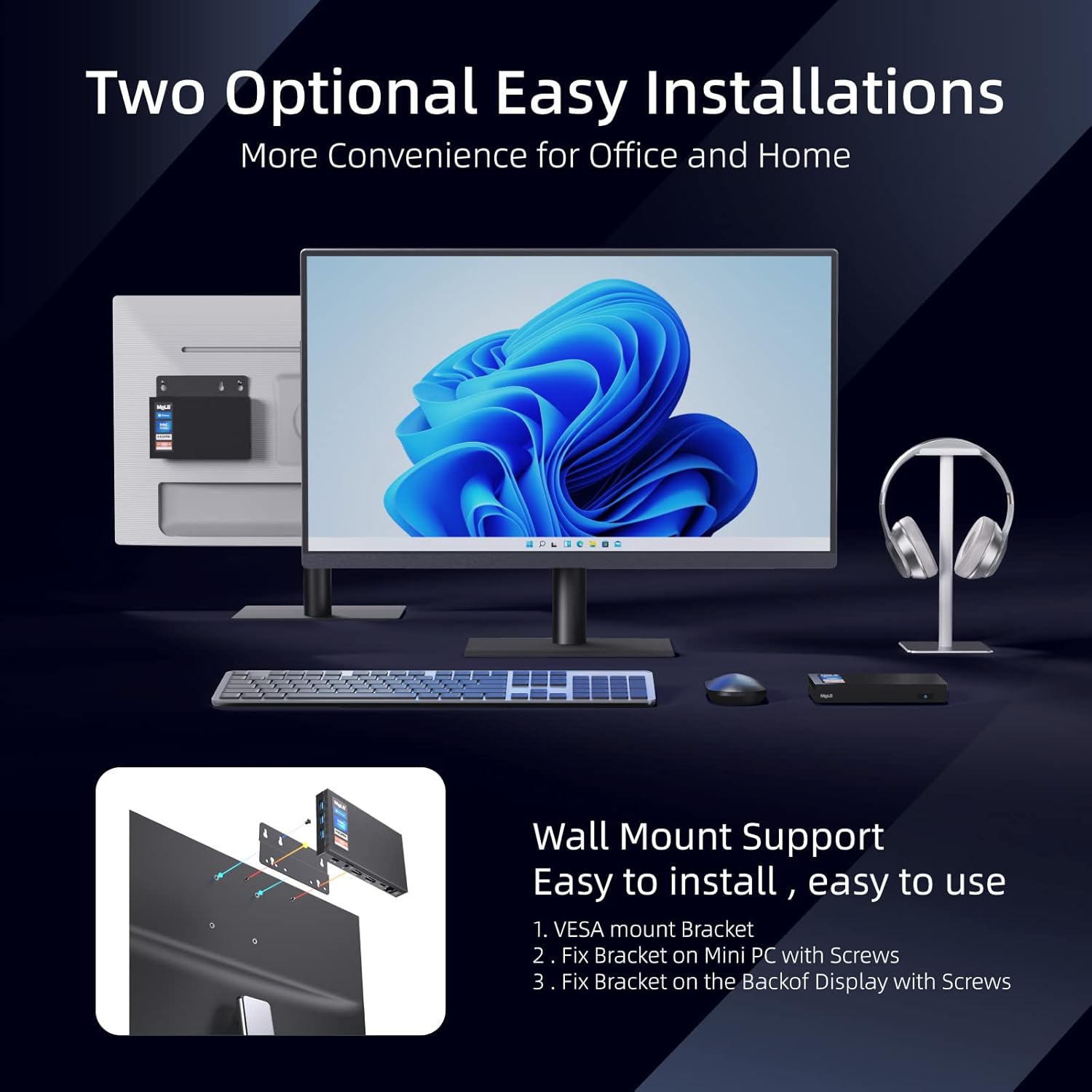 • 【Безвентилаторен, размер на длан и преносим дизайн】Малката компютърна система е с безвентилаторна технология с 0dB шум, осигурявайки тиха и комфортна работа. Компютърът с размер на длан може да се пъхне в чанта и лесно да се носи по време на бизнес пътувания. Настолният компютър е снабден и с VESA стойка, която ви позволява да го монтирате на гърба на телевизор или монитор.