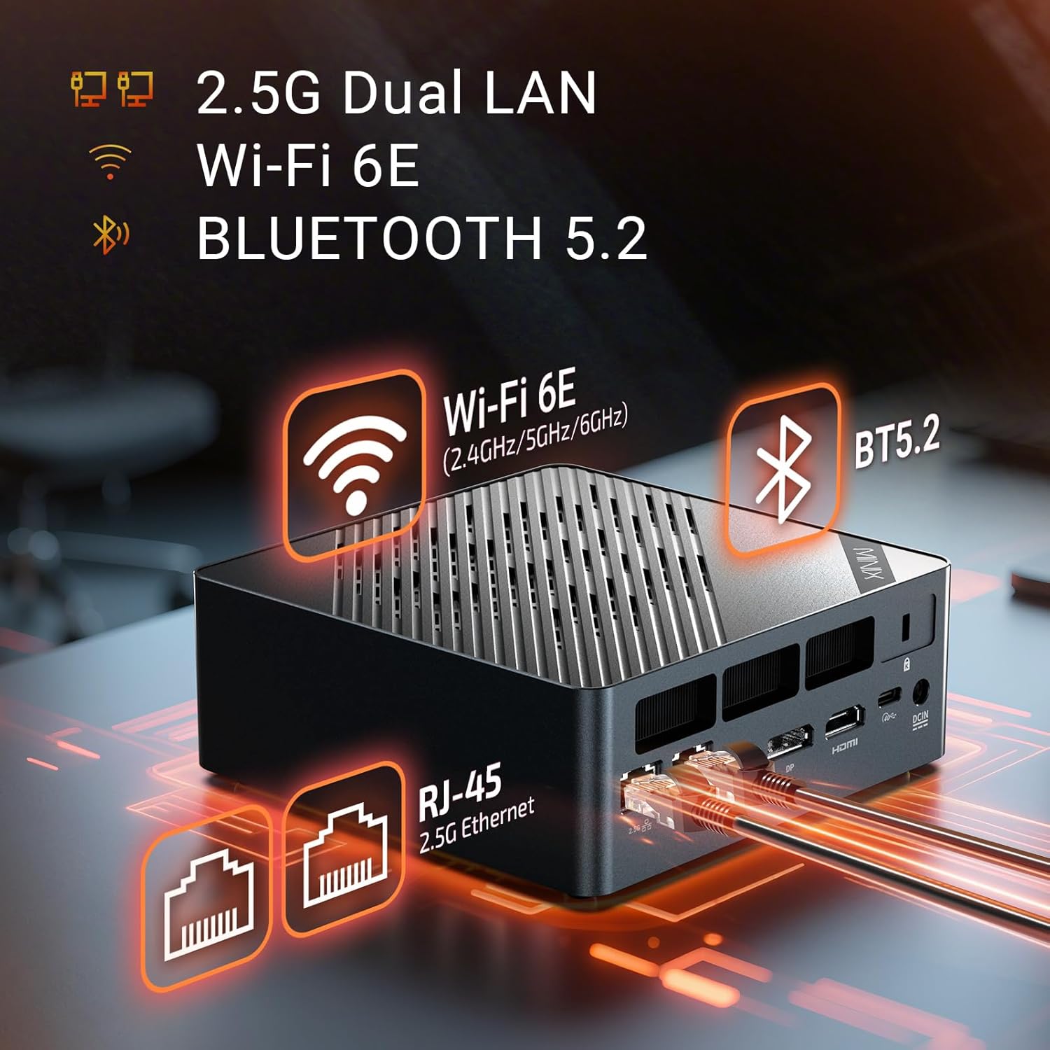 • 【Двойна LAN, WiFi 6/ BT5.2】С двоен Ethernet (2.5Gbps и 1Gbps), Wi-Fi 6 и Bluetooth 5.2, ще се насладите на ултрабързи интернет скорости за безпроблемни видеоконферентни връзки, дистанционна работа, стрийминг и прехвърляне на файлове, като същевременно осигурявате надеждна и стабилна свързаност.