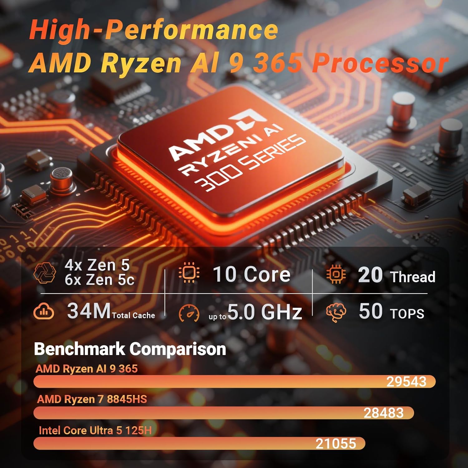Мини компютър MINIX Elite ER936-AI, AMD Ryzen AI 9 365 (10-ядрен), 32GB DDR5-5600MHz, 1TB PCIe 4.0 SSD, Radeon 880M, 73 TOPS AI, 4×8K@60Hz дисплея, WiFi 6E, за игри, създаване на съдържание, бизнес