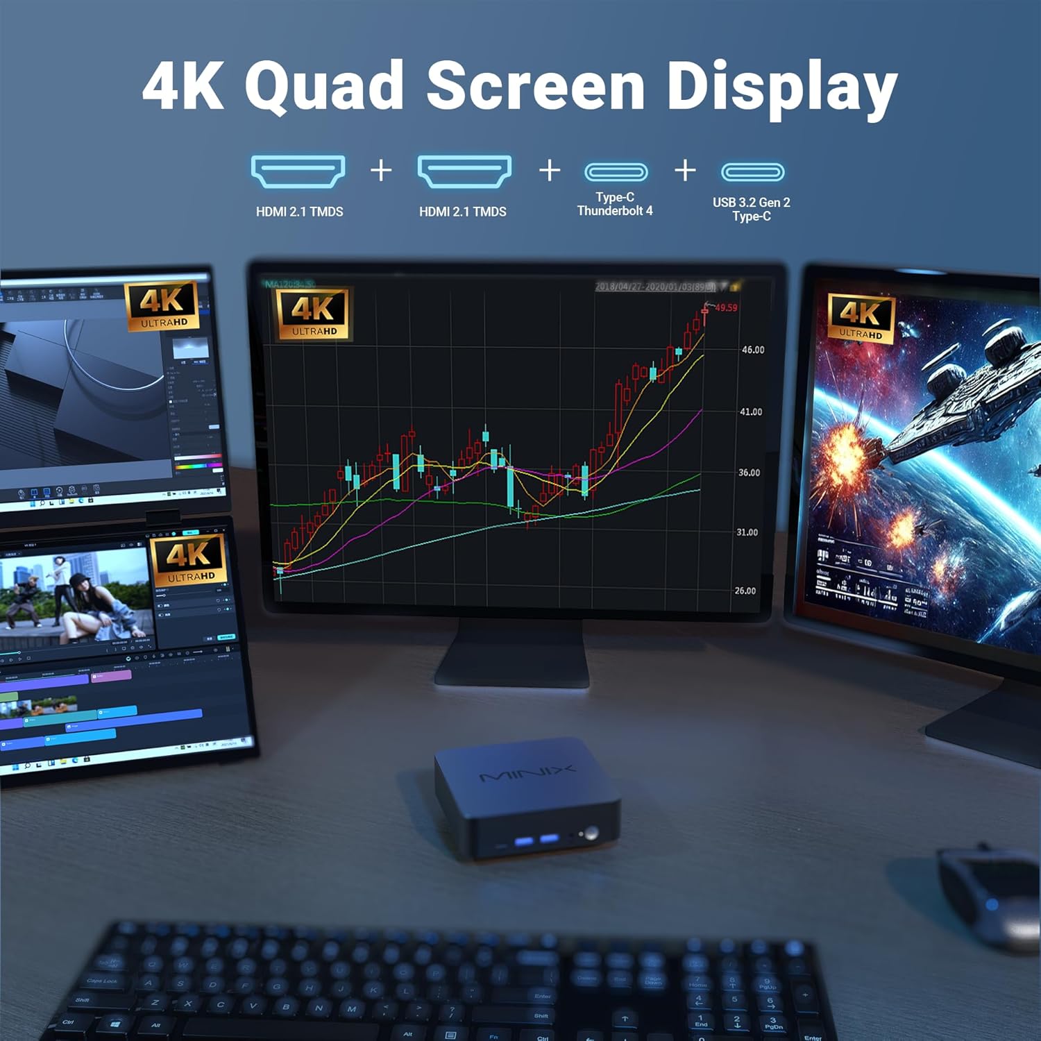• 【4K многоекранен дисплей за подобрена продуктивност】 Насладете се на по-ефективно работно място с троен дисплей или четири екрана, работещи с 4K резолюция. Изходите включват HDMI, Thunderbolt 4 (8K@60Hz) и USB-C, осигурявайки максимална гъвкавост на дисплея за многозадачни хора, дизайнери и дистанционни работници.
