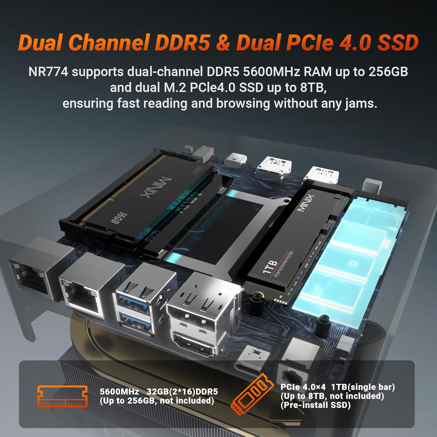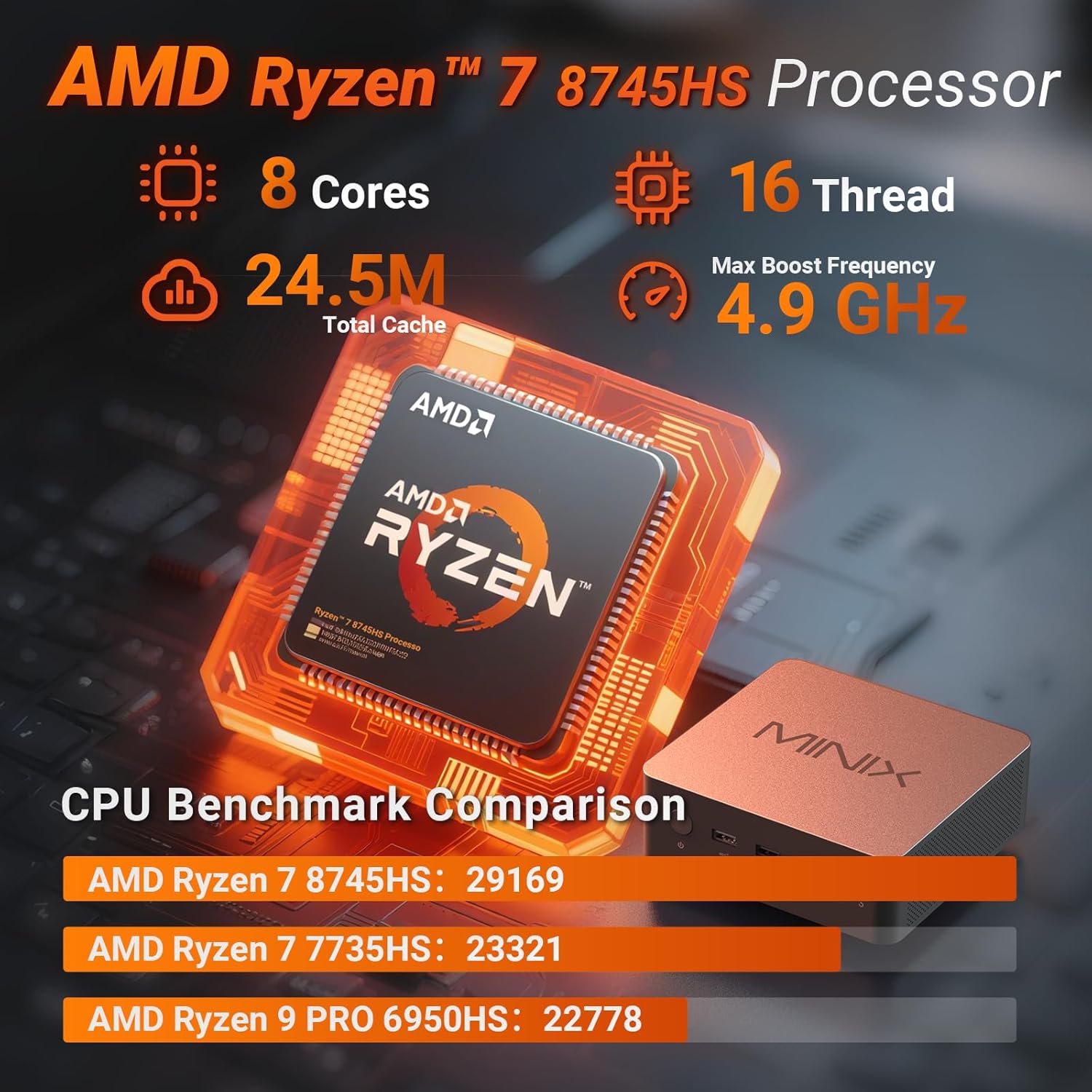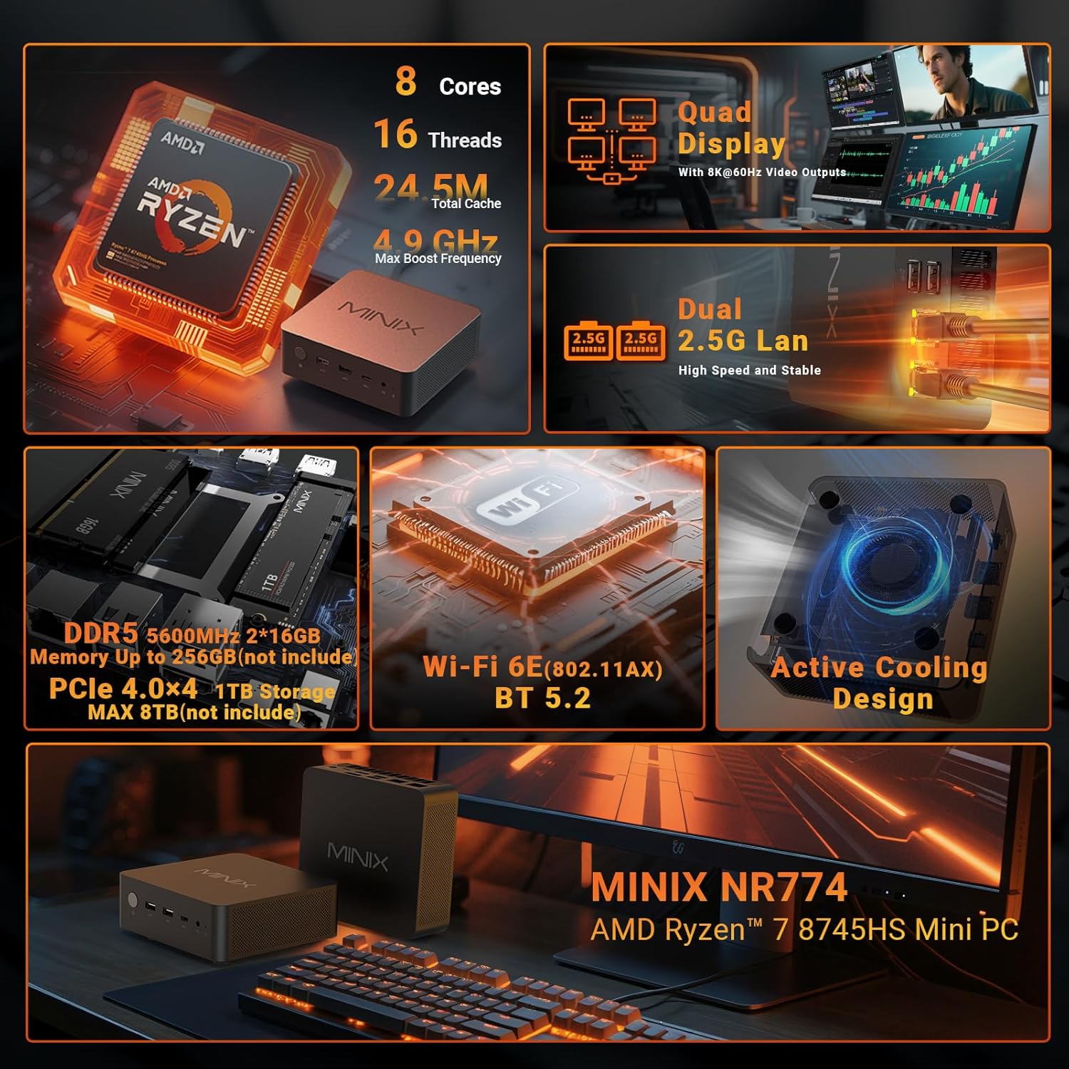 Мини компютър MINIX NR774 с AMD Ryzen 7 8745HS и Radeon 780M, 32GB DDR5 RAM, 1TB PCIe 4.0 SSD, USB4.0, двоен 2.5G LAN, WiFi 6E, BT5.2, 8K, поддръжка на четири дисплея, Windows 11 Pro, настолен компютър за домашен офис