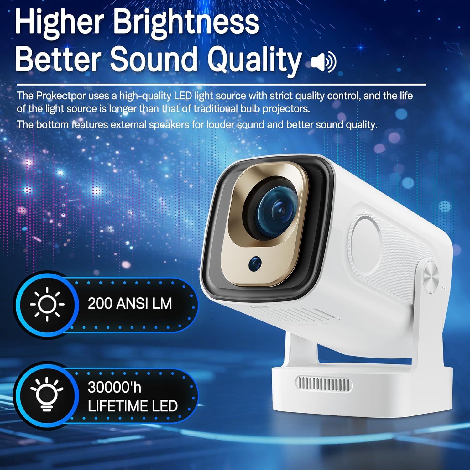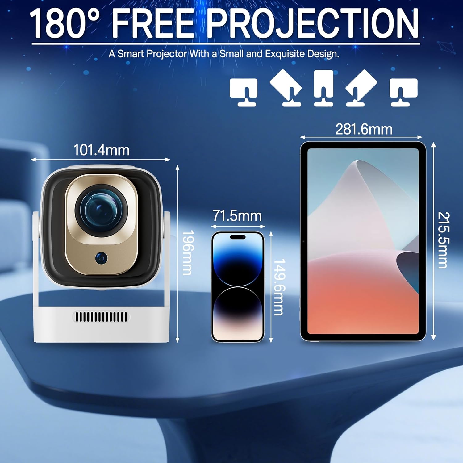 Мини проектор 4K Full HD 1080P мини проектор въртящ се на 180° видео проектор поддържа 2.4/5G двоен WiFi6 Bluetooth 5.4 с Android 11.0 проектор за домашно кино на открито моторизиран фокус