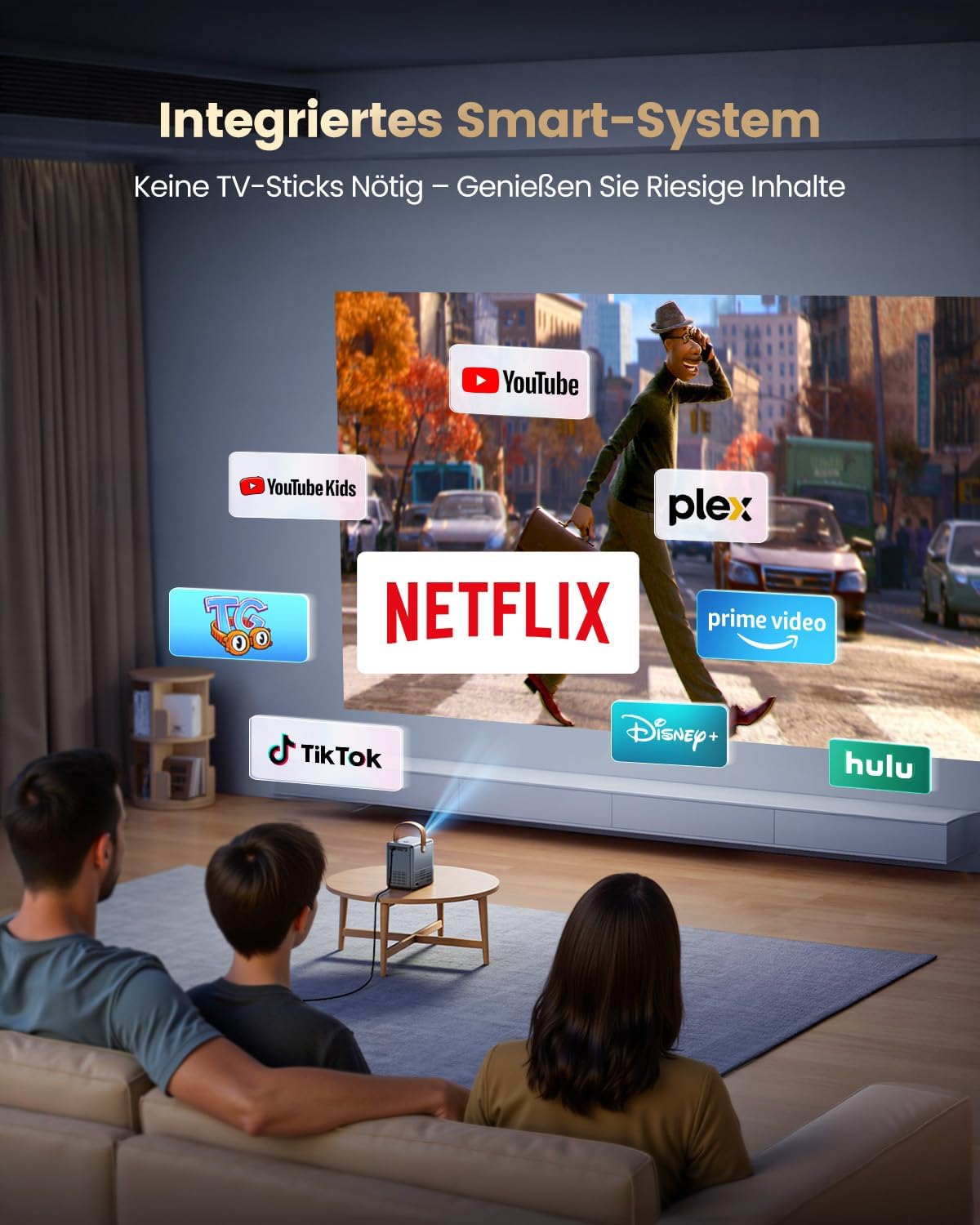 Мини проектор 4K [Netflix Official|Dolby Audio] Смарт проектор, малък, с WiFi6, 2-посочен Bluetooth, Full HD 1080P, електрически фокус, вертикална корекция на трапецовидно изкривяване, проектор за къси разстояния, вградени приложения