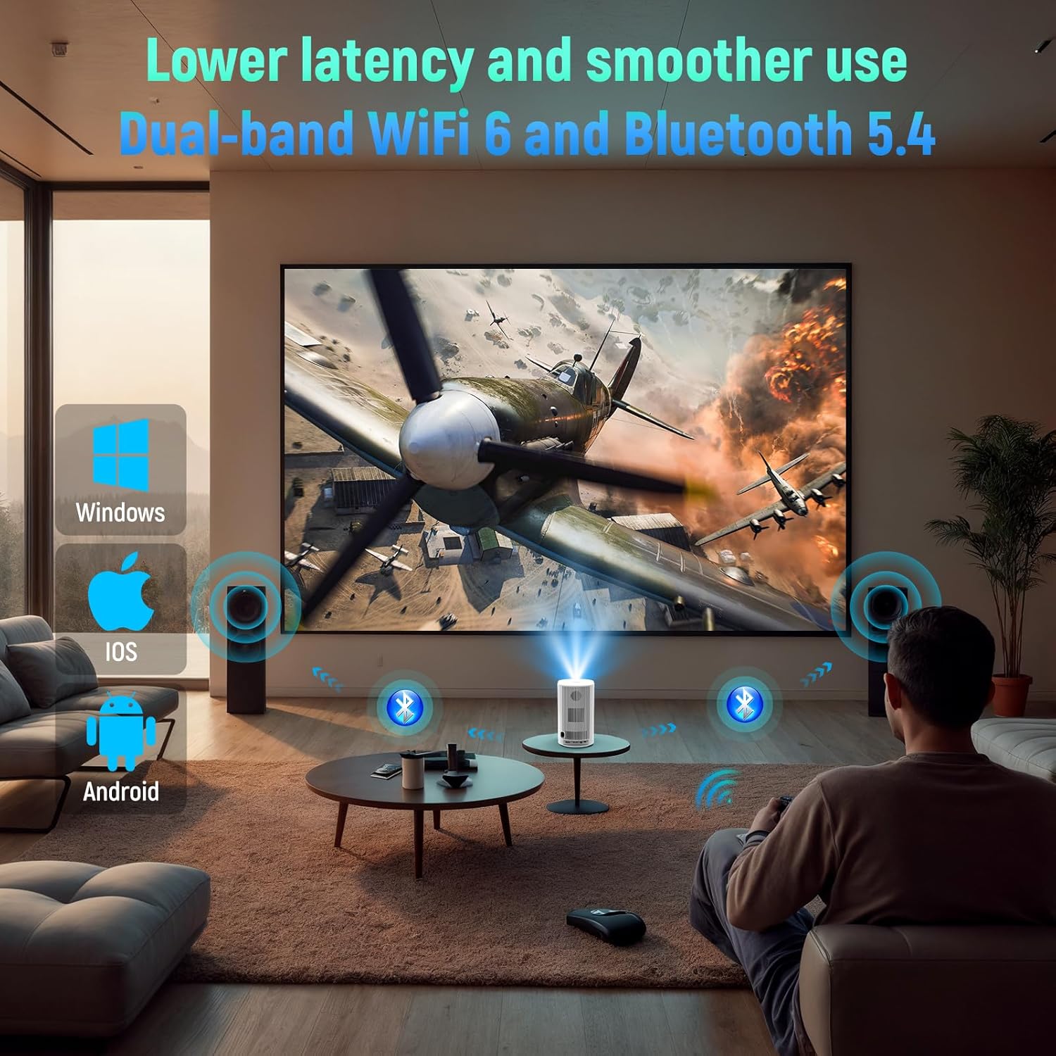 • Безжичен WiFi 6 интелигентен проектор: Кажете сбогом на конвенционалното HDMI кабелно прожектиране. Този мини проектор има вграден WiFi 6 за по-бързи скорости на трансфер и по-ниски забавяния. Той може лесно да се свърже със смартфони, лаптопи и др. и се свързва успешно в рамките на 5 секунди, за да осигури бързо и стабилно прожектиране на видеоклипове, игри и др.