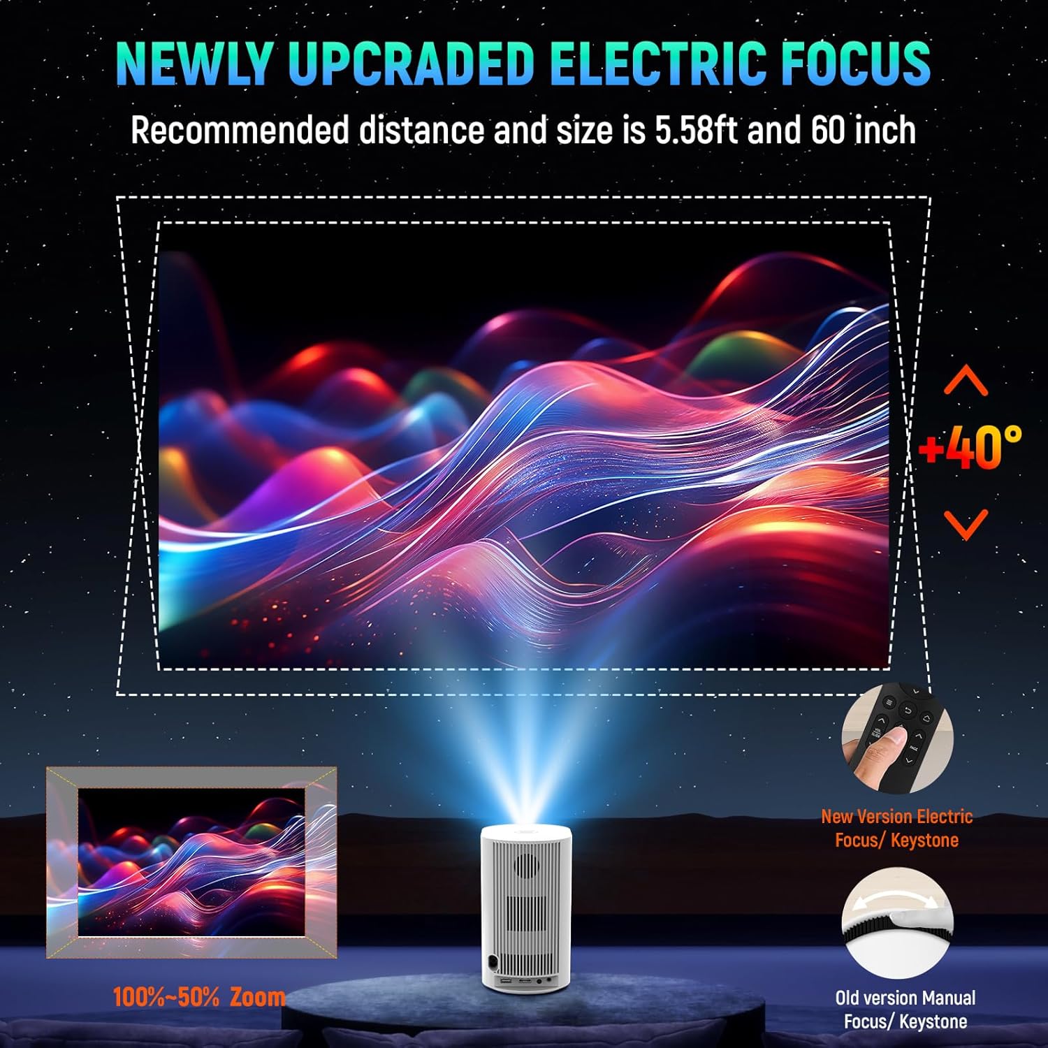 • Висококачествено изображение: Този мини проектор поддържа резолюция от 1080P 4K и осигурява ясни и детайлни изображения. Той използва усъвършенствана технология за цветове и поддържа HDR10, HLG и др. Цветовете са живи и реалистични и създават реалистични визуални ефекти. Оптималното разстояние на прожектиране е 1,78 м, а размерът на прожектиране е 152 см. Автоматичната хоризонтална корекция на трапецовидното изкривяване осигурява оптимална позиция на прожектиране.