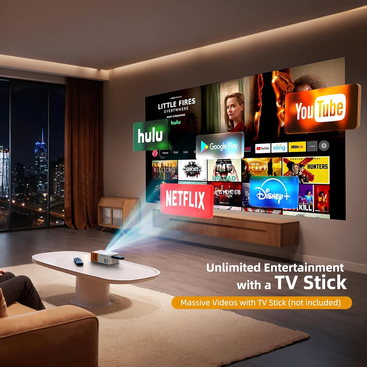 • Bluetooth 5.4 аудио: с вградения стерео високоговорител можете да се насладите на аудиовизуално кино изживяване, без да е необходимо да свързвате външни високоговорители. Освен това, този мини проектор е оборудван с технология Bluetooth 5.4, за да направи синхронизацията на звука по-бърза и по-стабилна. С този Bluetooth проектор можете безжично да свържете идеалните си Bluetooth високоговорители или слушалки по всяко време за още по-добър звук. Моля, обърнете внимание: Bluetooth връзката е само за предаване на звук с аудио устройства (Bluetooth високоговорители или Bluetooth слушалки и др.), които не могат да се използват за дублиране на екрана на смартфон.