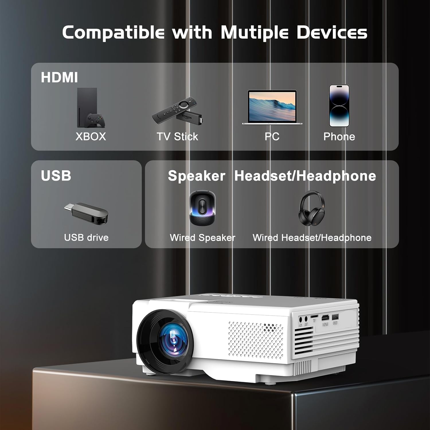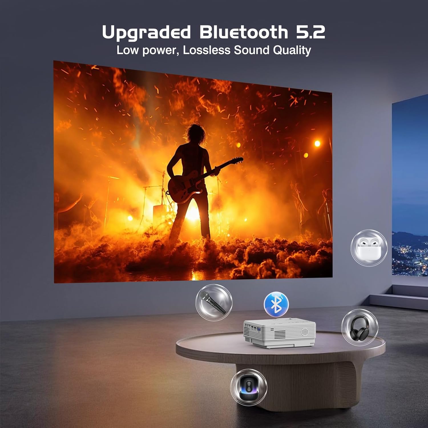 • Усъвършенствана 5G WiFi връзка за 5 секунди: Оборудван с най-новата 5G/2.4G двубандова WiFi, проекторът може да се свърже директно с вашите устройства чрез домашна WiFi връзка за 5 секунди, без забавяне на звука или видеото. В сравнение с други обикновени проектори на пазара, не е необходимо да купувате подходящи адаптери, за да свържете мобилните си телефони/таблети или лаптопи.