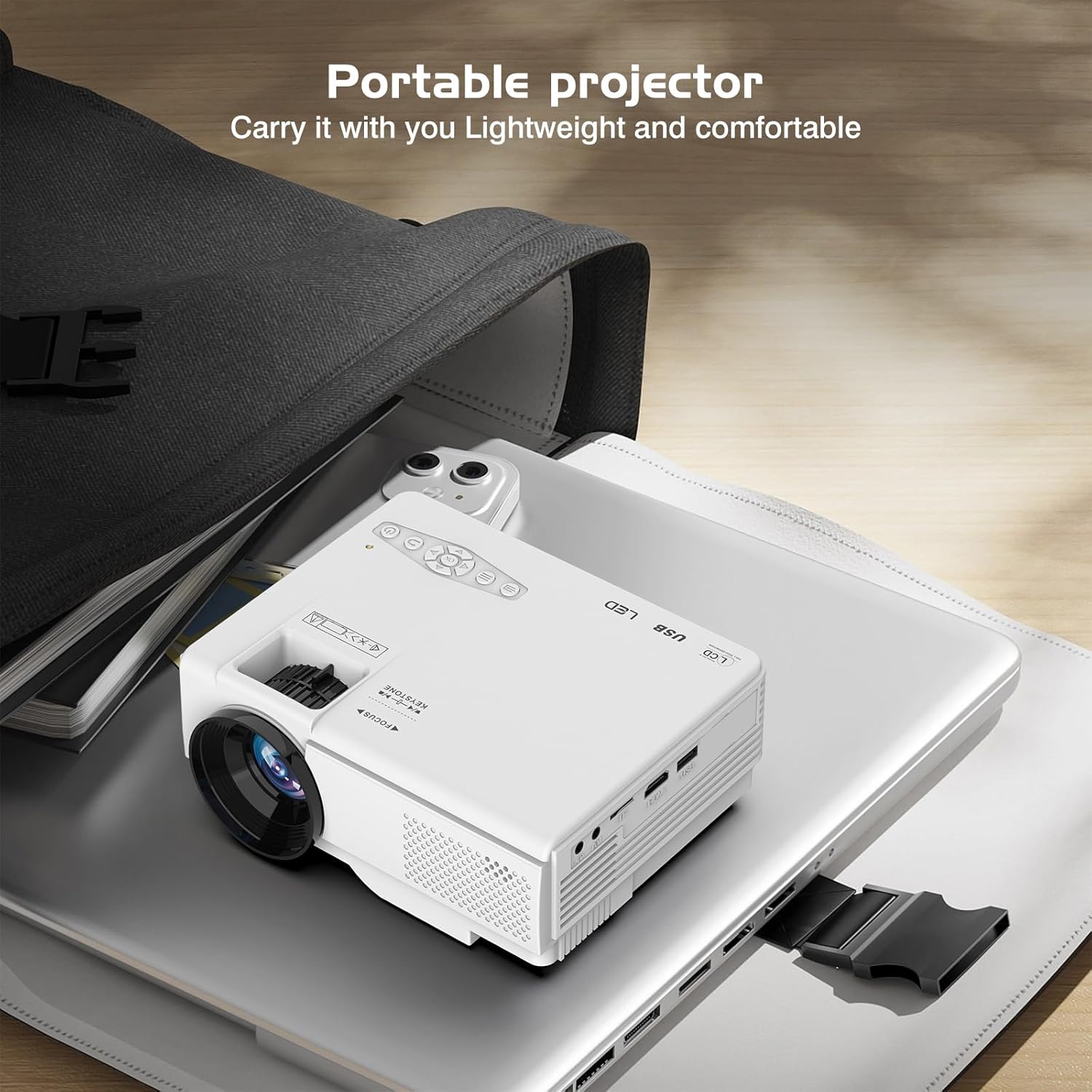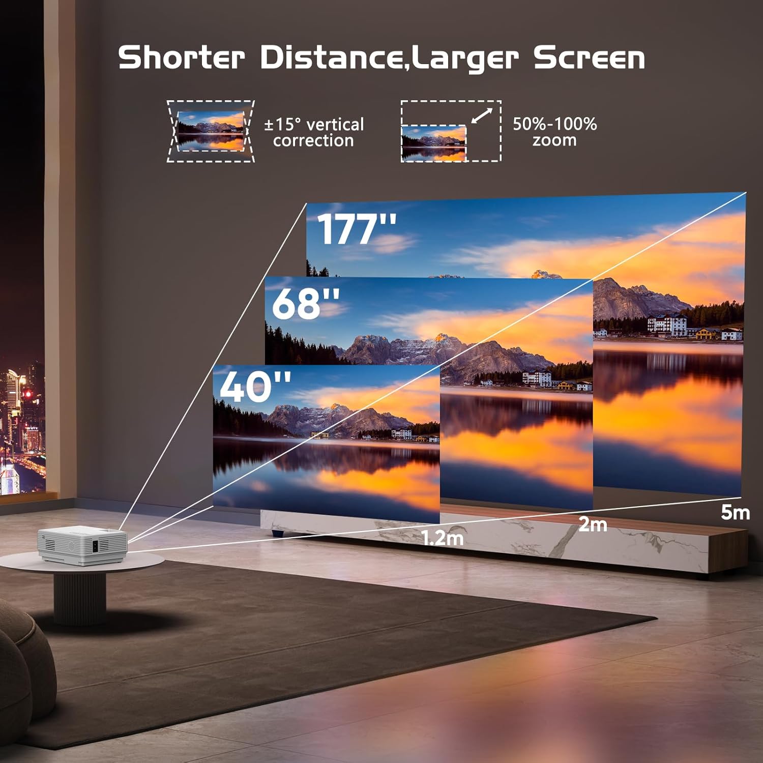 • Преносим, ​​но мощен: Благодарение на компактния си размер, можете лесно да го вземете със себе си в движение. Благодарение на малкия си размер, той се вписва добре и в дома ви. Можете да го поставите навсякъде, за да се насладите на кинематографично изживяване с още по-добра яркост и рязкост от по-големите проектори. Чрез регулиране на разстоянието от 1,5 до 5 м се показва по-големият екран от 40 до 200 инча. С функцията за мащабиране от 100% до 50% можете да регулирате размера на екрана, без да местите проектора.