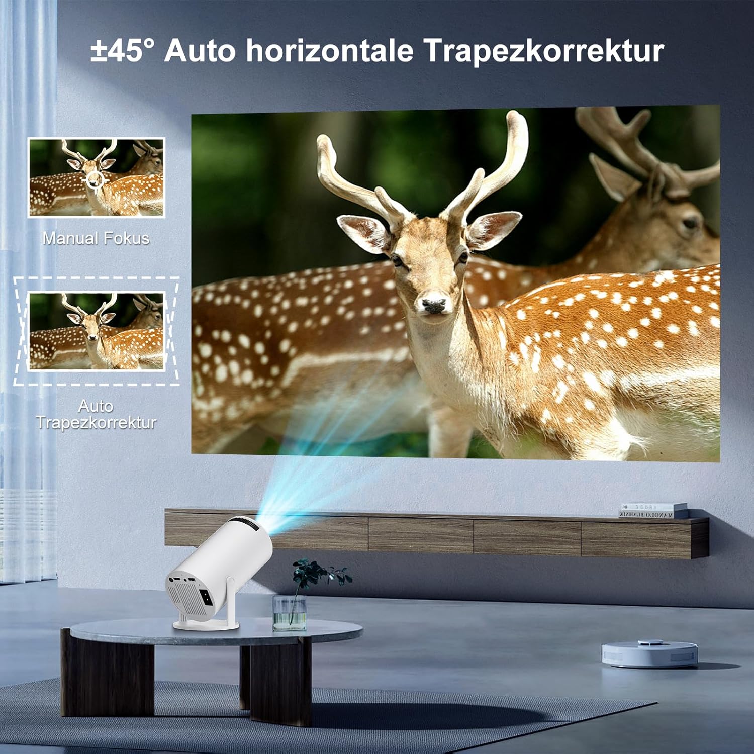 • Автоматична корекция: проекторът има ръчно фокусиране, което може да настройва фокуса фино, за да се постигне най-добра яснота, така че да можете да правите по-детайлни настройки и да постигате по-добро качество на изображението. Функцията за автоматична корекция на трапецовидното изкривяване на проектора може интелигентно да разпознае и коригира изображението и по този начин гарантира, че изображението е квадратно, независимо дали е проектирано настрани или монтирано на тавана.
