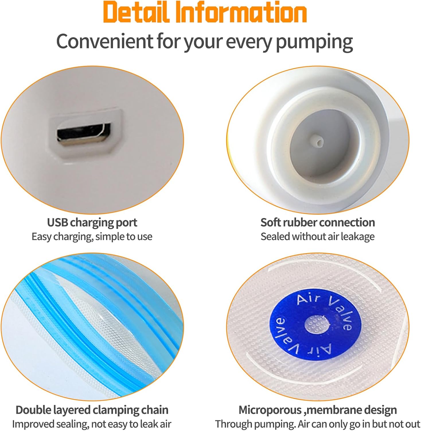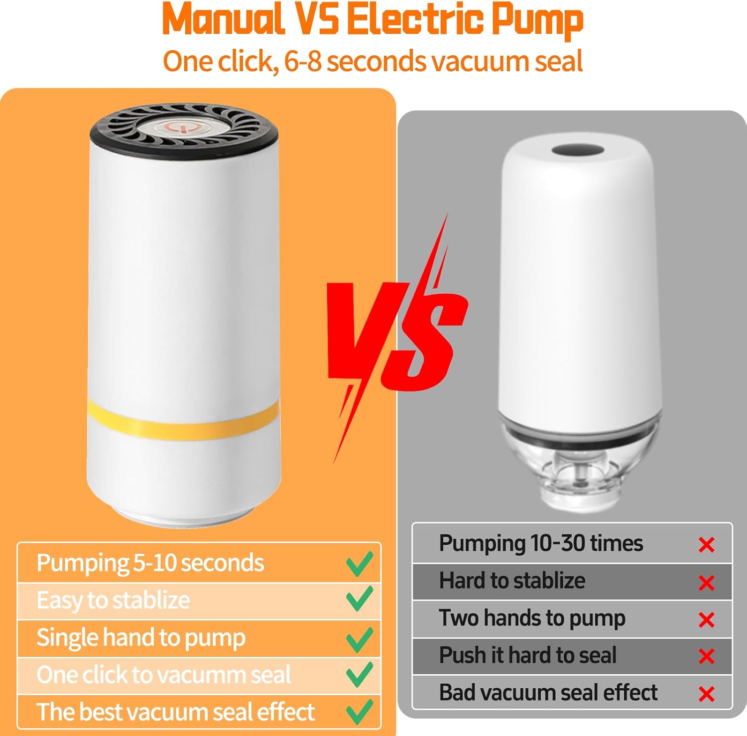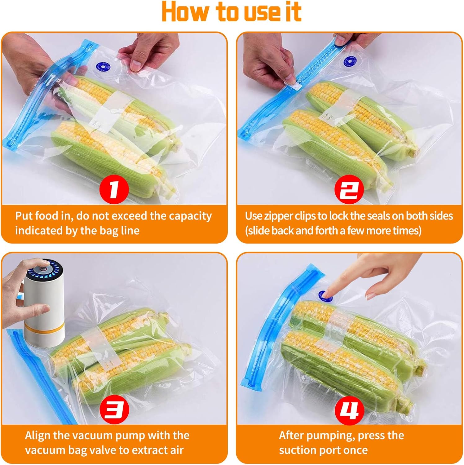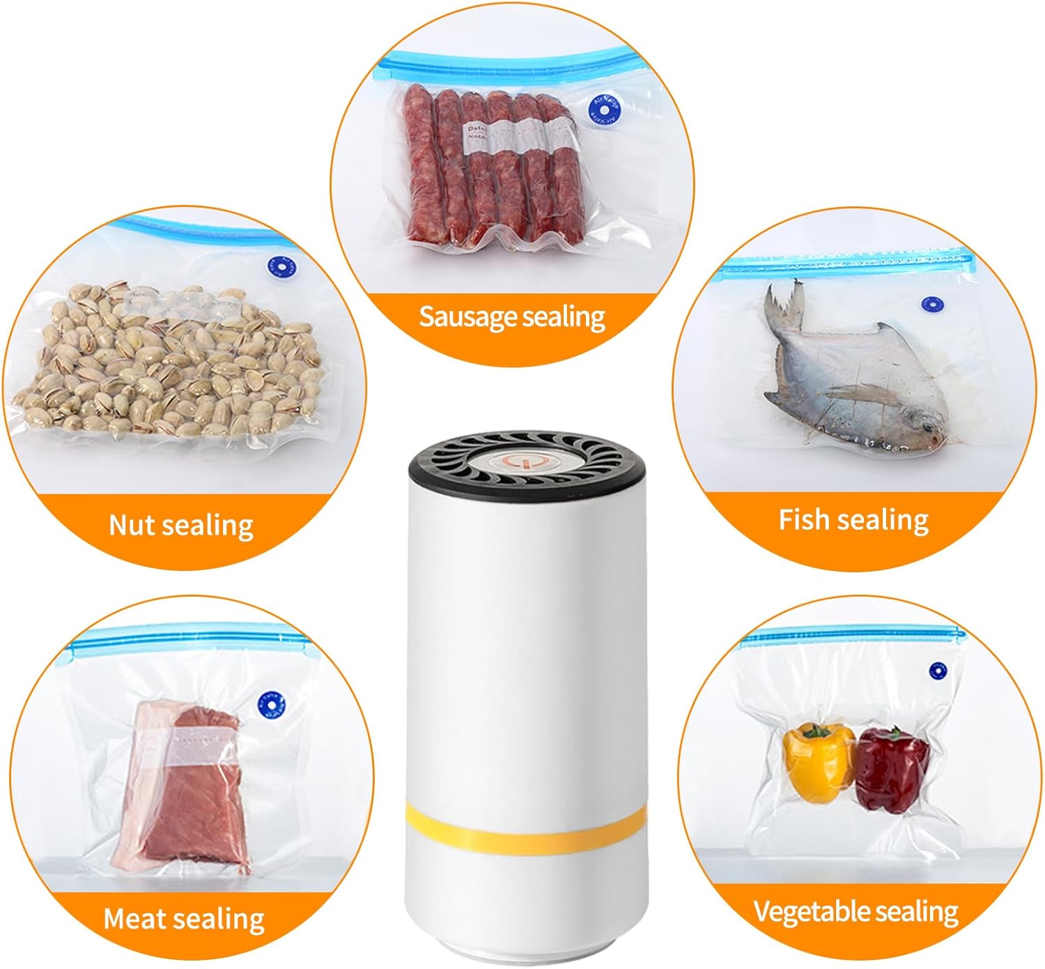 Преносим вакуумен уред за запечатване на храна. Зарежда се чрез USB, предлага се с 10 торбички за многократна употреба, компактен и преносим, вакуумен уред за суха или мокра храна.