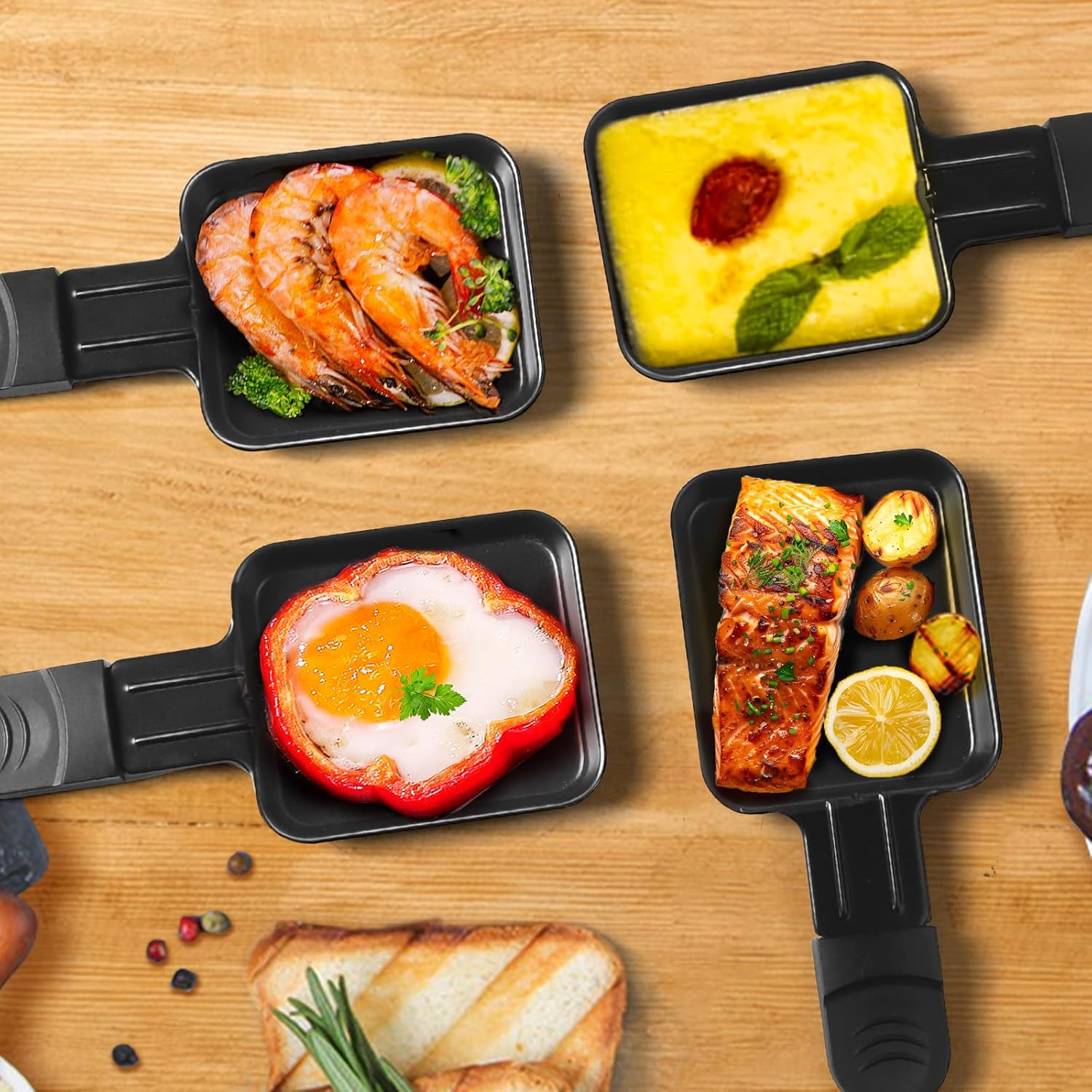 Тиганите Raclette 4 могат да се използват за готвене на хляб, картофи, месо и много други.