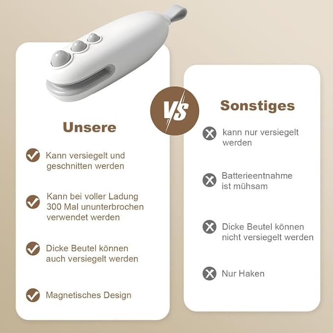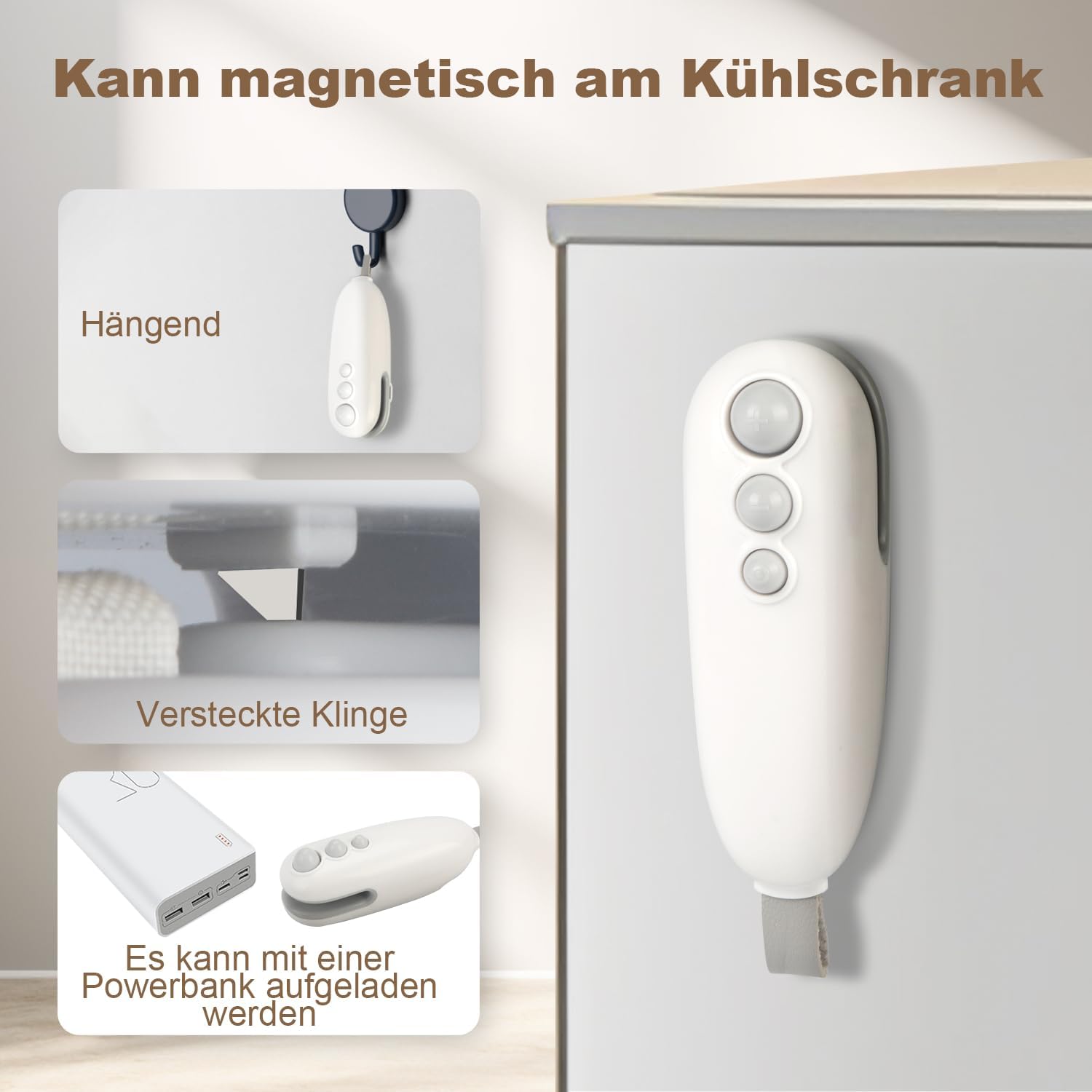 • 2 в 1 устройство за запечатване и рязане: Нашият уред за запечатване на торбички комбинира функциите на запечатване и рязане, което го прави универсален инструмент за по-дълго запазване на свежестта на вашите закуски и остатъци от храна. Само с едно устройство можете лесно и прецизно да запечатвате и режете пластмасови торбички.