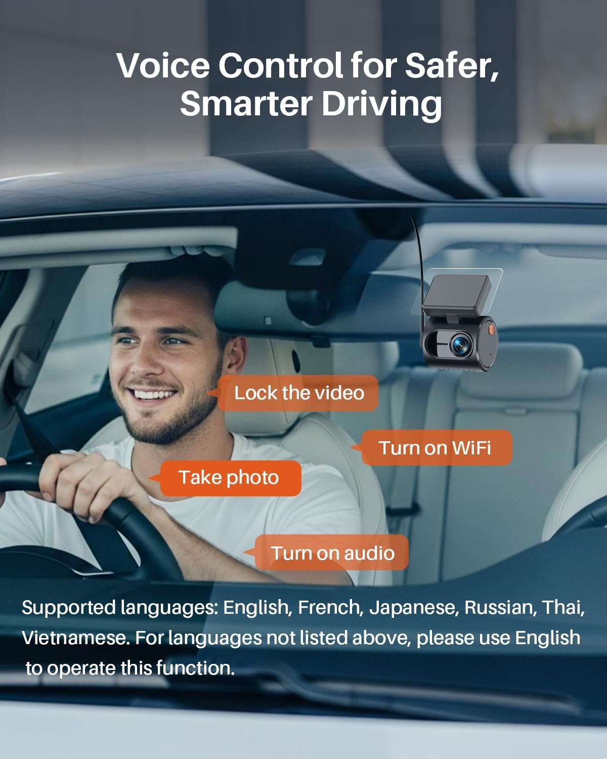 • 【Гласово управление, по-безопасно шофиране!】– Просто го кажете и е готово! Тази видеорегистратор реагира на гласови команди на английски език, като „направи снимка“ или „заключи видеото“, което ви позволява да държите ръцете си на волана, а очите си на пътя. Без натискане на бутони, без разсейване – просто шофирайте по-умно и безопасно. *** Поддържани езици: английски, френски, японски, руски, тайландски, виетнамски. За езици, които не са изброени по-горе, моля, използвайте английски, за да работите с тази функция. ***