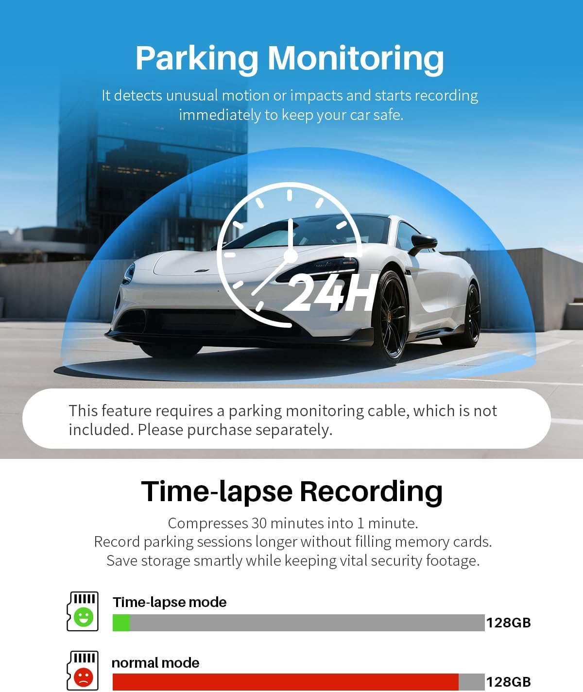 • 【Мониторинг на паркирането (необходим е комплект за свързване)】– Притеснявате се за паркирания си автомобил? Активирайте функцията за наблюдение с комплект за свързване (продава се отделно, ASIN: B0D93FTP6T). Видеорегистраторът ще наблюдава автомобила ви, когато не сте там.