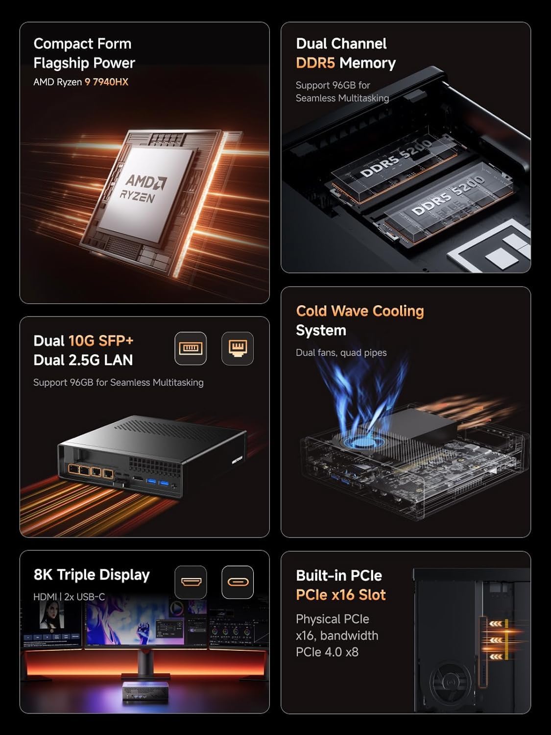 MINIS FORUM MS-A2 Мини работна станция, процесор AMD Ryzen 9 7940HX, 16C/32T до 5.2GHz, AMD Radeon 610M, 32GB DDR5/1TB PCIe 4.0 SSD, HDMI/USB-C x 2/2.5G RJ45 x 2/10G SFP+ x 2, PCIEx16, Wi-Fi. Fi, BT