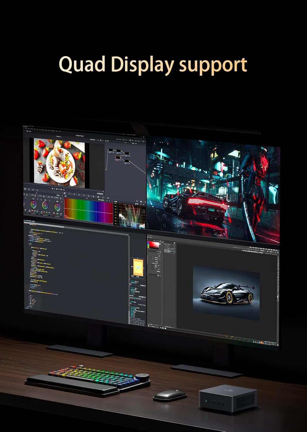 • 【2 x USB4 и HDMI 2.1】UM790 Pro разполага с два напълно функционални 40G USB4 порта с поддръжка на PD-IN и PD-OUT. Независимо дали става въпрос за монитор, преносим дисплей или докинг станция, всичко може лесно да се свърже (минимална необходима мощност PD 65W, максимална изходна мощност PD 15W). С 4 x USB-A порта, 2 x HDMI 2.1 и 2 x USB4, могат да се свържат до четири 4K дисплея, което го прави подходящ за различни сценарии на приложение.