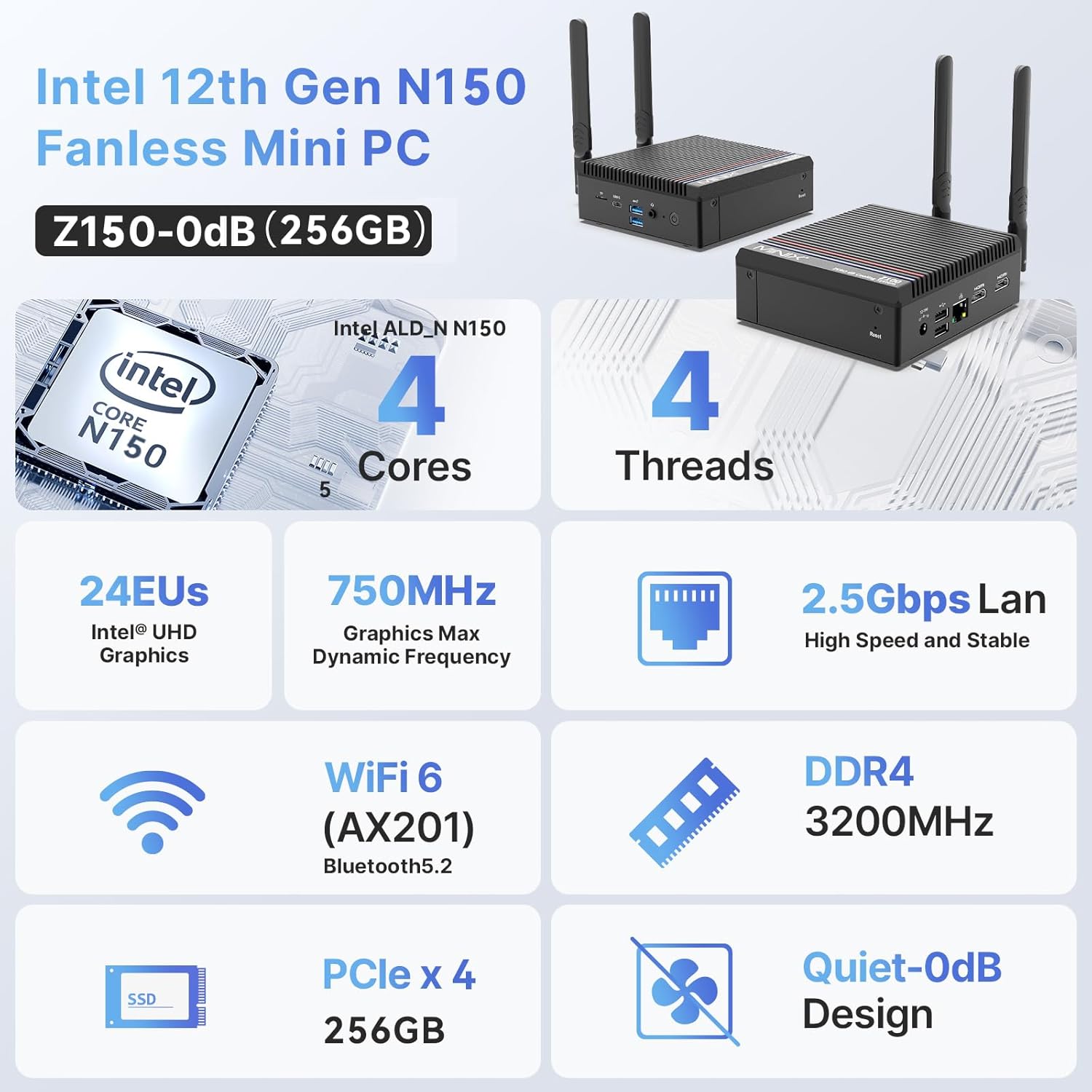MINIX Z150-0dB Безвентилаторен мини компютър, Intel N150 (ъпгрейднат N100), 8GB DDR4/256GB PCIe Gen3 x 4 SSD/4K два дисплея/2.5G LAN/USB-C/Windows 11 Pro/Автоматично включване, за домашен офис, промишленост и търговски обекти