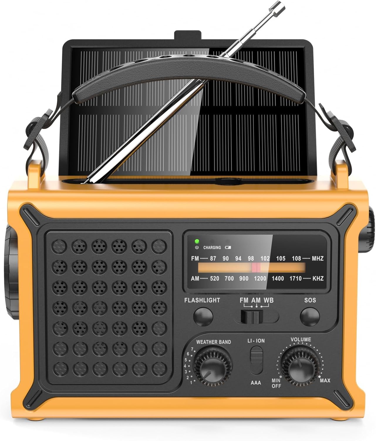 • 4 опции за зареждане + захранване с висок капацитет 12000mAh: зареждайте радиото със соларен панел, ръчна манивела, Type-C порт или 3 AAA батерии (не са включени). С вградената външна батерия с капацитет 12000 mAh можете да зареждате вашия смартфон или други устройства чрез USB порт или Type-C порт. Множество опции за резервно захранване, които ви позволяват да продължите, дори ако няма прекъсване на захранването или прекъсване на захранването!