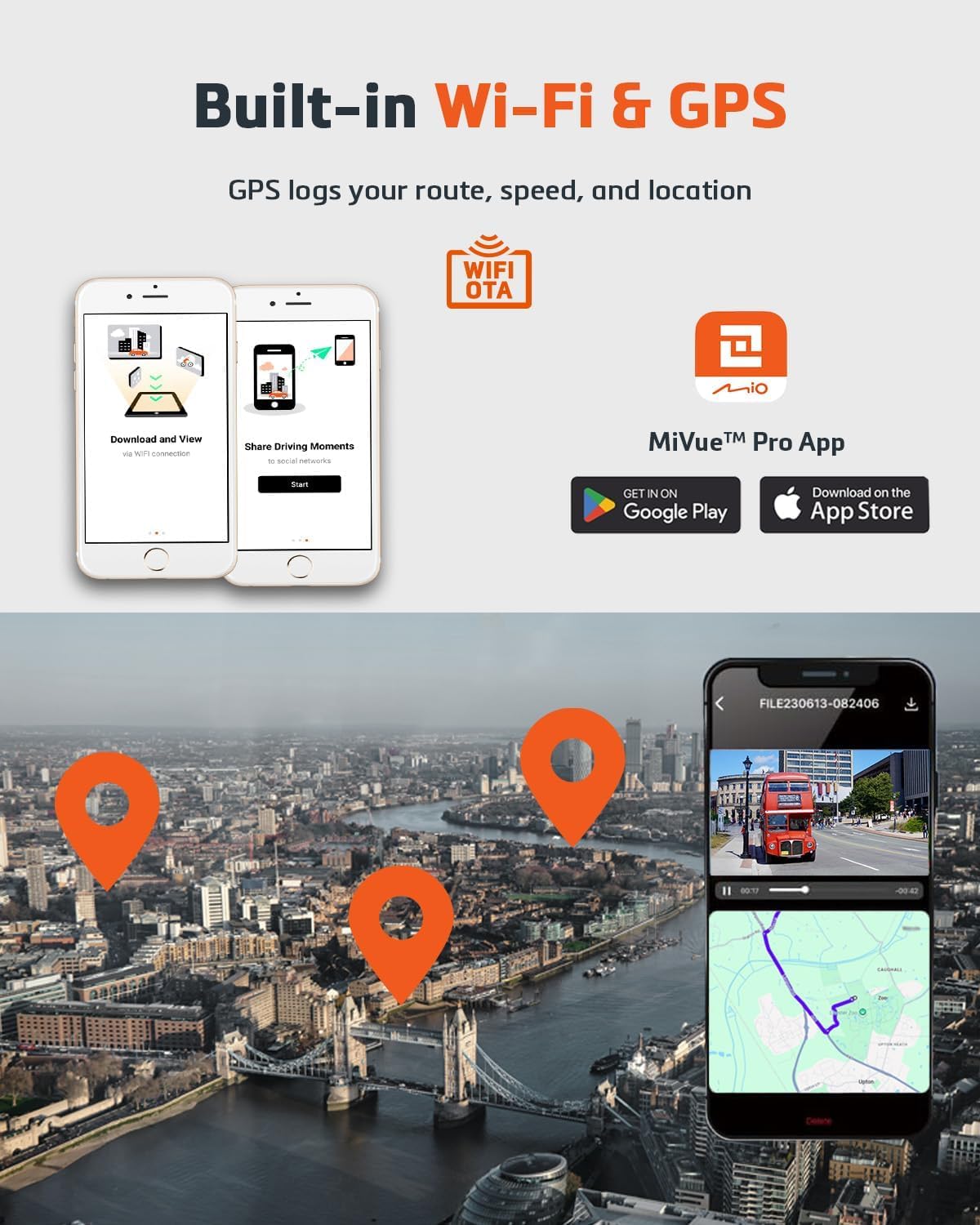 Das integrierte hochschnelle WIFI ermöglicht Hochgeschwindigkeitsübertragungen, was das Herunterladen von Videos zusätzlich beschleunigt. Scannen Sie den am MiVue 955W Pro gezeigten QR-Code über die App MiVue Pro App zur einfachen und schnellen WIFI-Verbindung in einem Schritt.