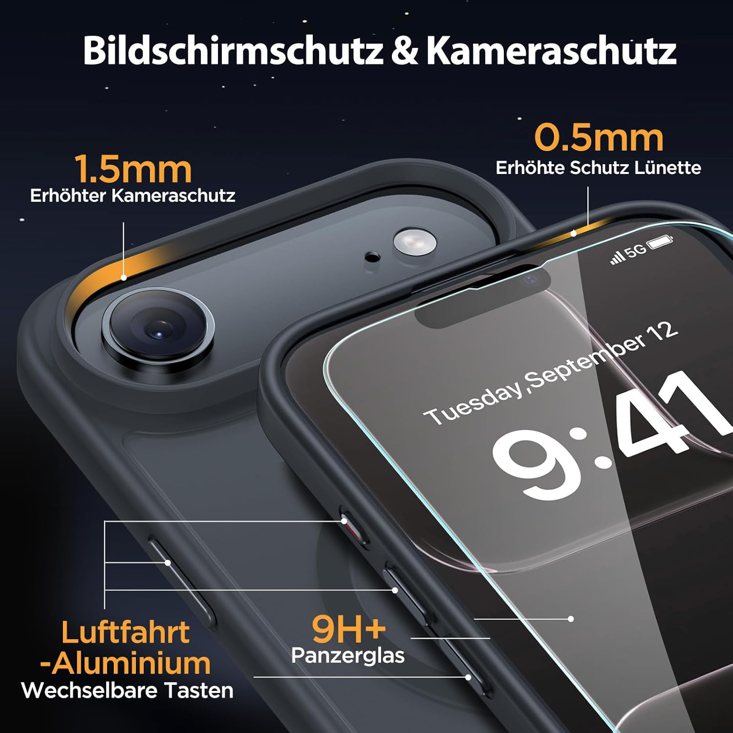 • Цялостна защита и първокласна функционалност: Този калъф за iPhone 17 предпазва от надраскване с 9H+ стъклено фолио, а повдигнатата 1,5 мм рамка на камерата предпазва от удари и сблъсъци с обектива, осигурявайки непроменено качество на изображението. Свалящите се странични бутони от самолетен алуминий осигуряват първокласно тактилно усещане.