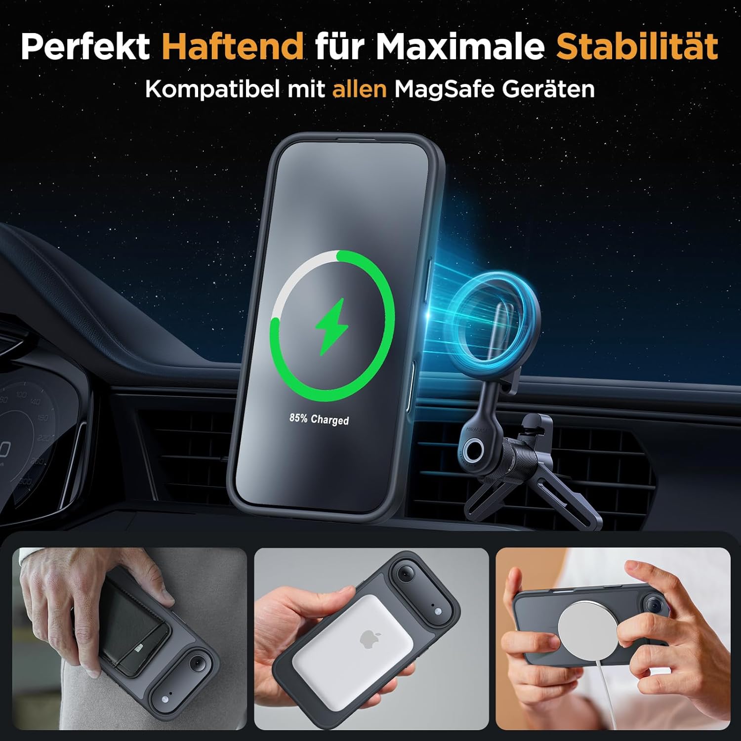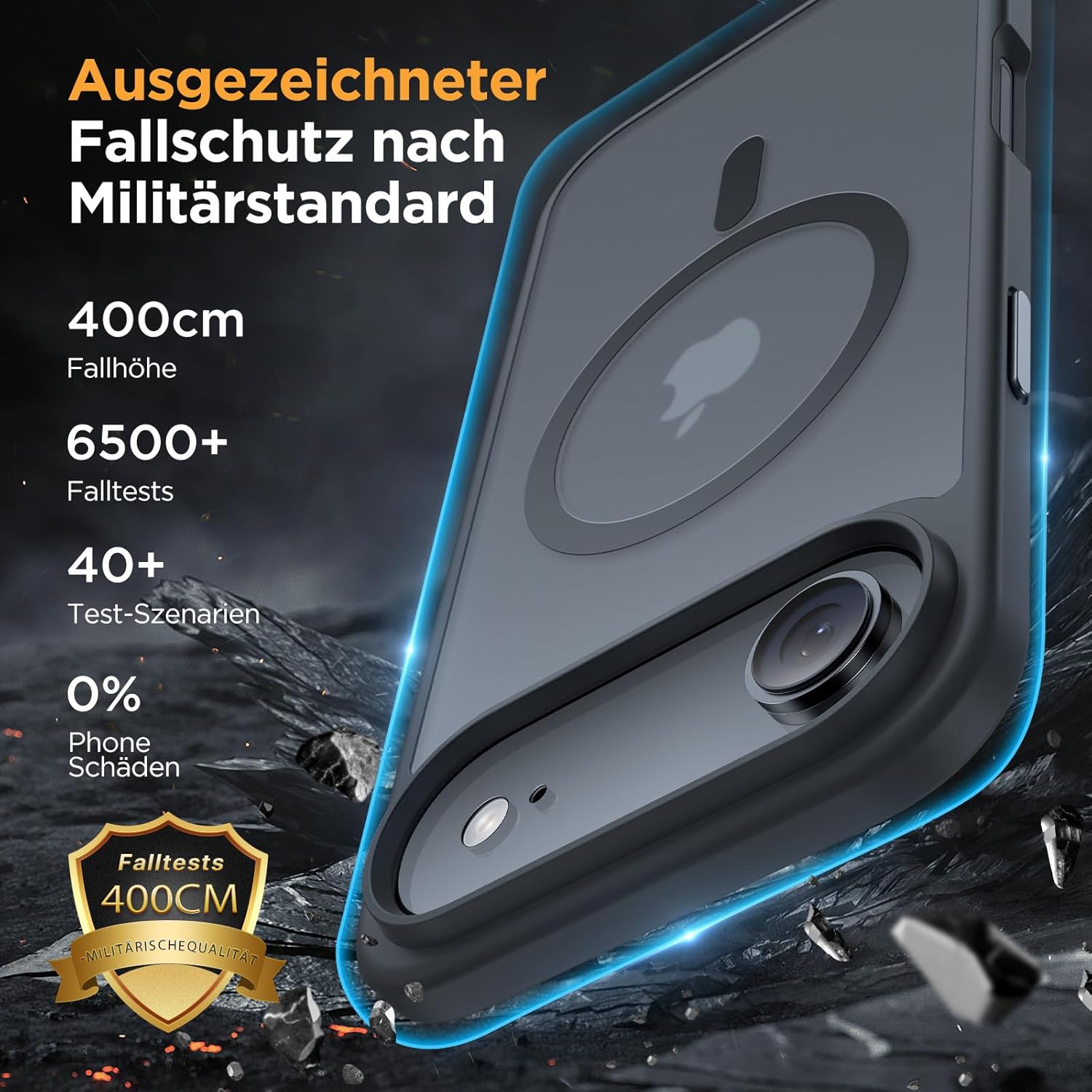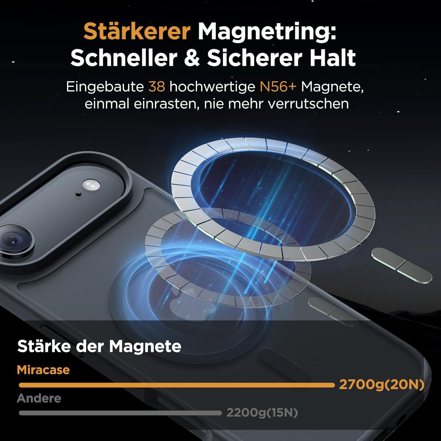 • Подобрена съвместимост с MagSafe: Специално проектиран калъф за iPhone 17 (6,3 инча): Интегрирана магнитна система 38 × N56+ с иновативен фокусен пръстен – 55% по-силно залепване от стандартните калъфи. Безпроблемно подравняване със зарядни устройства MagSafe за сигурно бързо зареждане от 25 W+, както и стабилно задържане на всички устройства MagSafe.