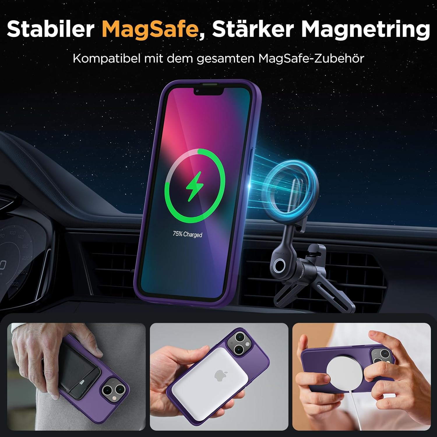 • Подобрена съвместимост с MagSafe: Специално проектиран калъф за iPhone 17 (6,3 инча): Интегрирана магнитна система 38 × N56+ с иновативен фокусен пръстен – 55% по-силно залепване от стандартните калъфи. Безпроблемно подравняване със зарядни устройства MagSafe за сигурно бързо зареждане от 25 W+, както и стабилно задържане на всички устройства MagSafe.