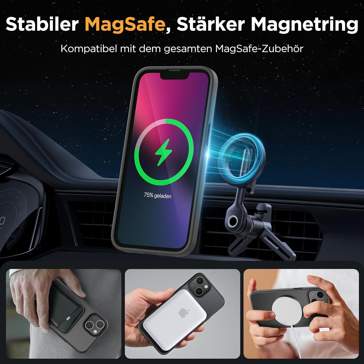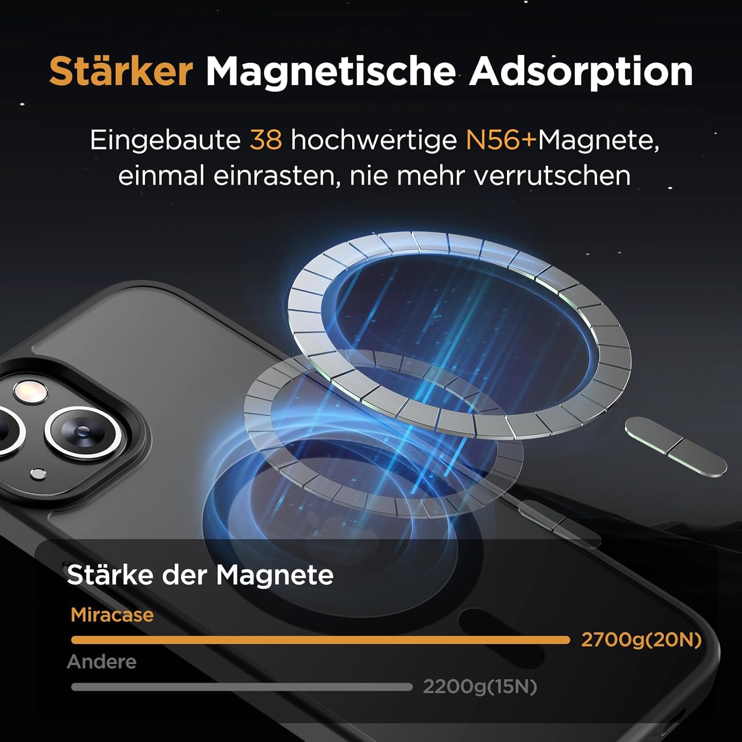 • Подобрена съвместимост с MagSafe: Специално проектиран калъф за iPhone 17 (6,3 инча): Интегрирана магнитна система 38 × N56+ с иновативен фокусен пръстен – 55% по-силно залепване от стандартните калъфи. Безпроблемно подравняване със зарядни устройства MagSafe за сигурно бързо зареждане от 25 W+, както и стабилно задържане на всички устройства MagSafe.