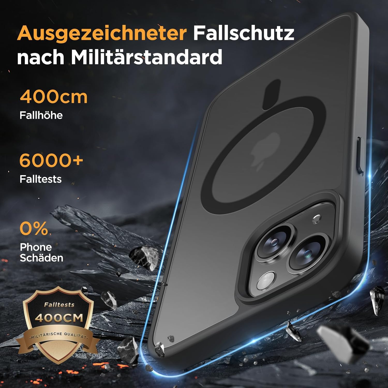 • Защита от падане от военен клас: Превишава военните стандарти MIL-STD-810G: Усъвършенствана технология за устойчивост на удари в четирите ъгъла, комбинирана с 360° въздушна възглавница отвътре и 3-слойна термопластична полиуретанова (TPU) подплата. Осигурява отлична защита срещу падания от височина до 4 метра – потвърдено от над 6500+ теста за падане в над 40 тестови среди.