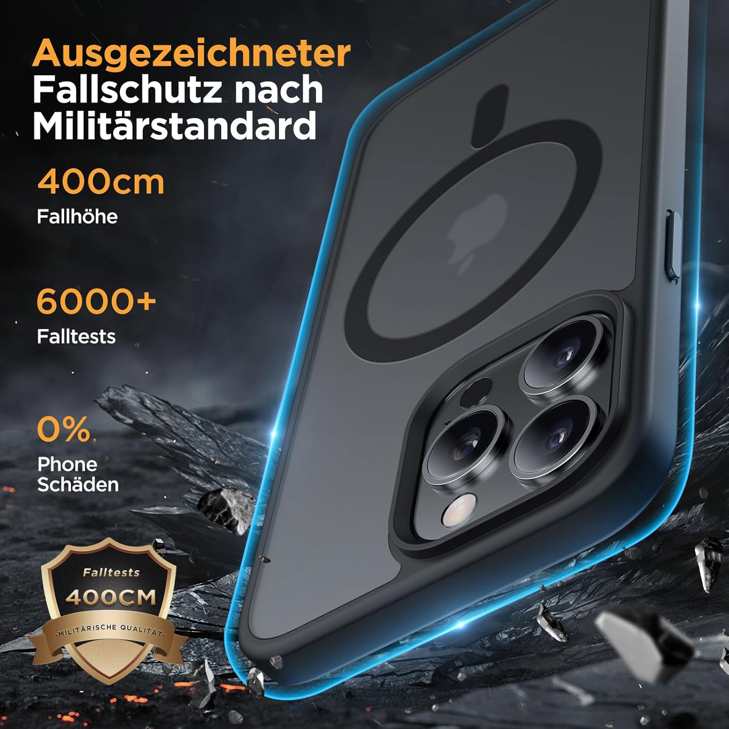 • Защита от падане от военен клас: Превишава военните стандарти MIL-STD-810G: Усъвършенствана технология за устойчивост на удари в четирите ъгъла, комбинирана с 360° въздушна възглавница отвътре и 3-слойна термопластична полиуретанова (TPU) подплата. Осигурява отлична защита срещу падания от височина до 4 метра – потвърдено от над 6500+ теста за падане в над 40 тестови среди.