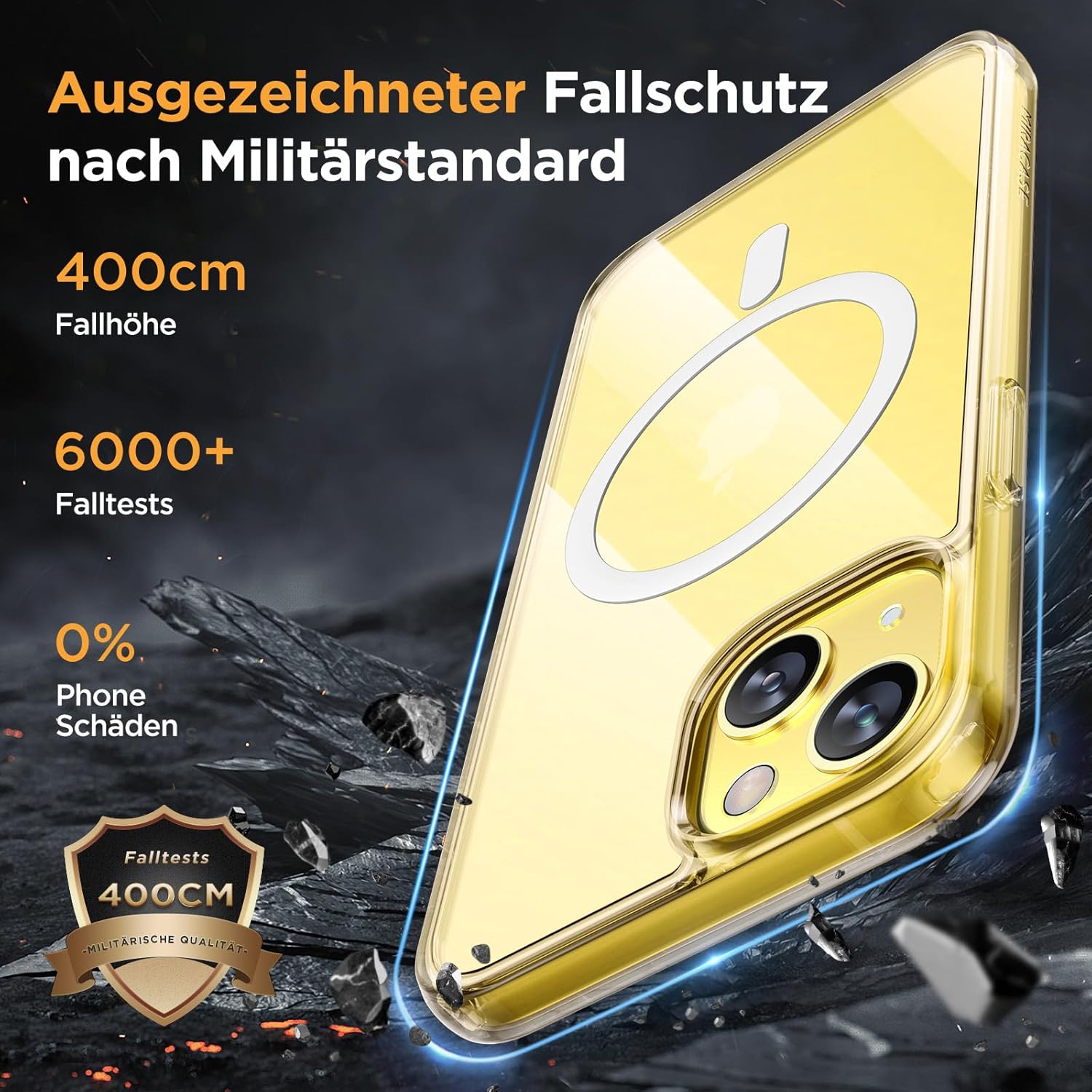 • Защита от падане от военен клас: Превишава военните стандарти MIL-STD-810G: Усъвършенствана технология за устойчивост на удари в четирите ъгъла, комбинирана с 360° въздушна възглавница отвътре и 3-слойна термопластична полиуретанова (TPU) подплата. Осигурява отлична защита срещу падания от височина до 4 метра – потвърдено от над 6500+ теста за падане в над 40 тестови среди.