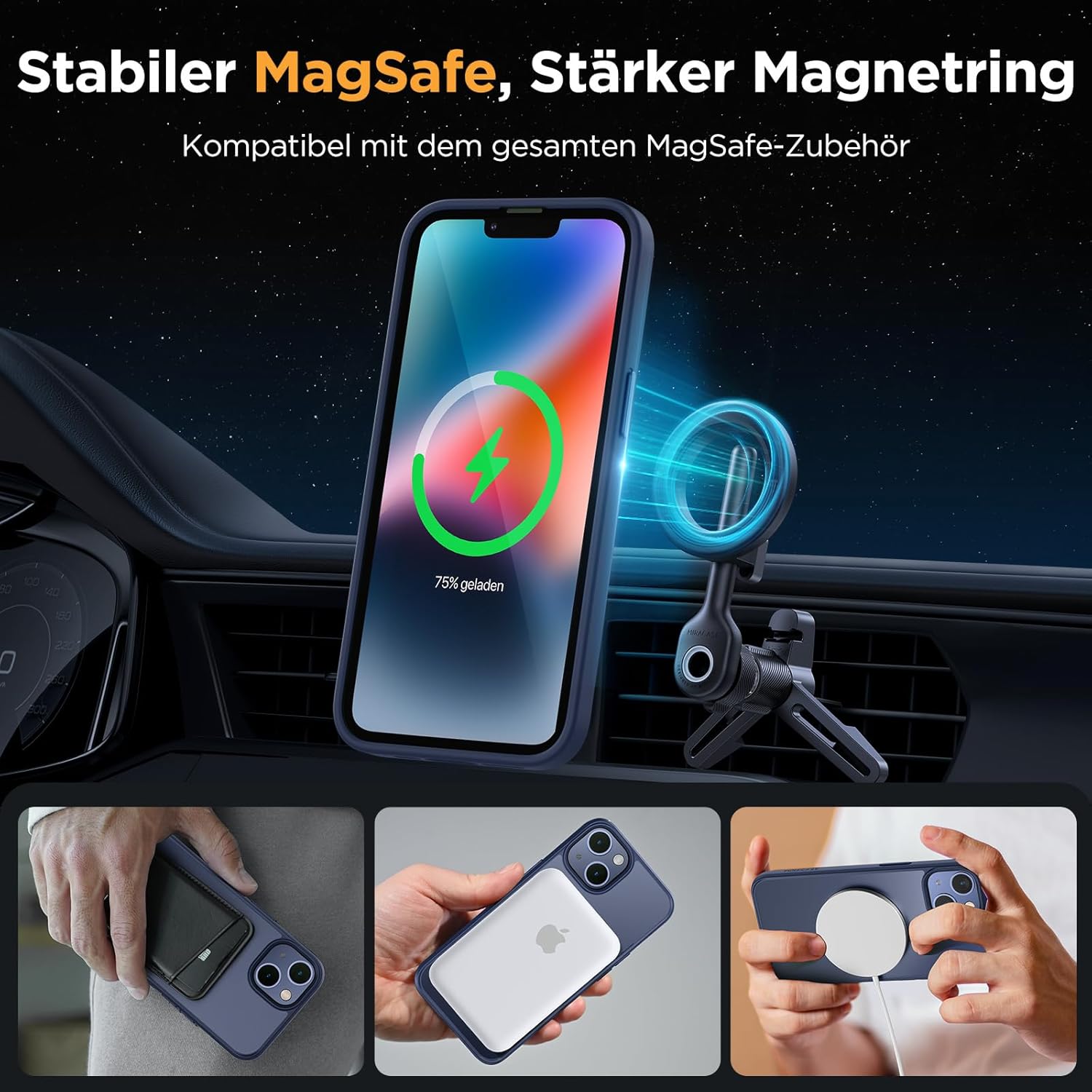 • Подобрена съвместимост с MagSafe: Специално проектиран калъф за iPhone 17 (6,3 инча): Интегрирана магнитна система 38 × N56+ с иновативен фокусен пръстен – 55% по-силно залепване от стандартните калъфи. Безпроблемно подравняване със зарядни устройства MagSafe за сигурно бързо зареждане от 25 W+, както и стабилно задържане на всички устройства MagSafe.