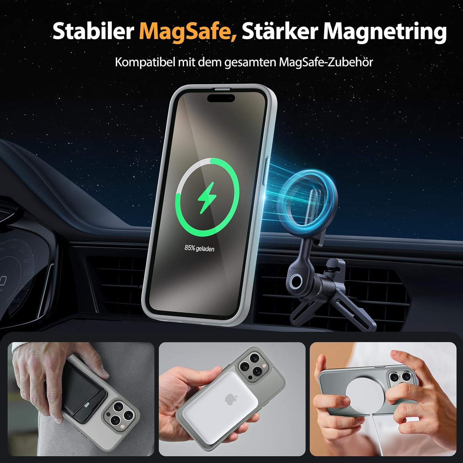 • Подобрена съвместимост с MagSafe: Специално проектиран калъф за iPhone 17 (6,3 инча): Интегрирана магнитна система 38 × N56+ с иновативен фокусен пръстен – 55% по-силно залепване от стандартните калъфи. Безпроблемно подравняване със зарядни устройства MagSafe за сигурно бързо зареждане от 25 W+, както и стабилно задържане на всички устройства MagSafe.