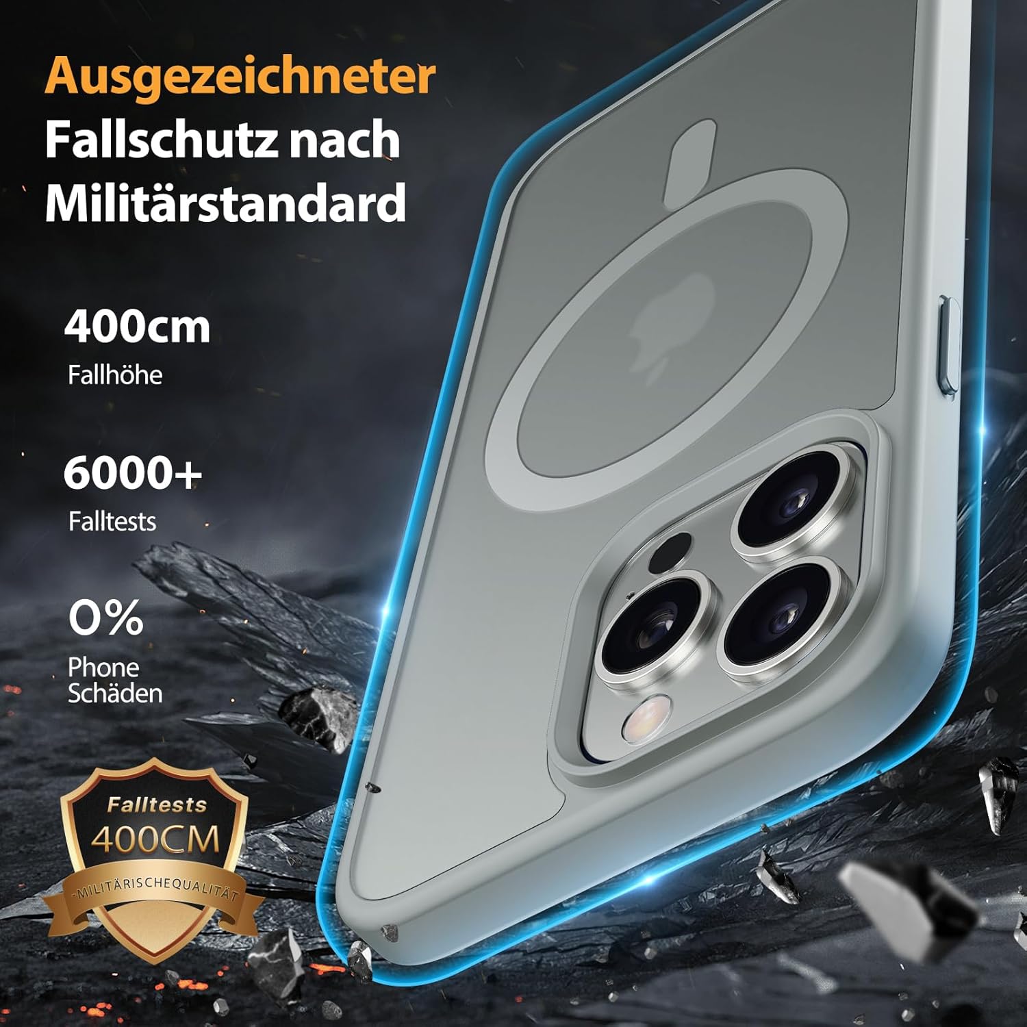 • Защита от падане от военен клас: Превишава военните стандарти MIL-STD-810G: Усъвършенствана технология за устойчивост на удари в четирите ъгъла, комбинирана с 360° въздушна възглавница отвътре и 3-слойна термопластична полиуретанова (TPU) подплата. Осигурява отлична защита срещу падания от височина до 4 метра – потвърдено от над 6500+ теста за падане в над 40 тестови среди.