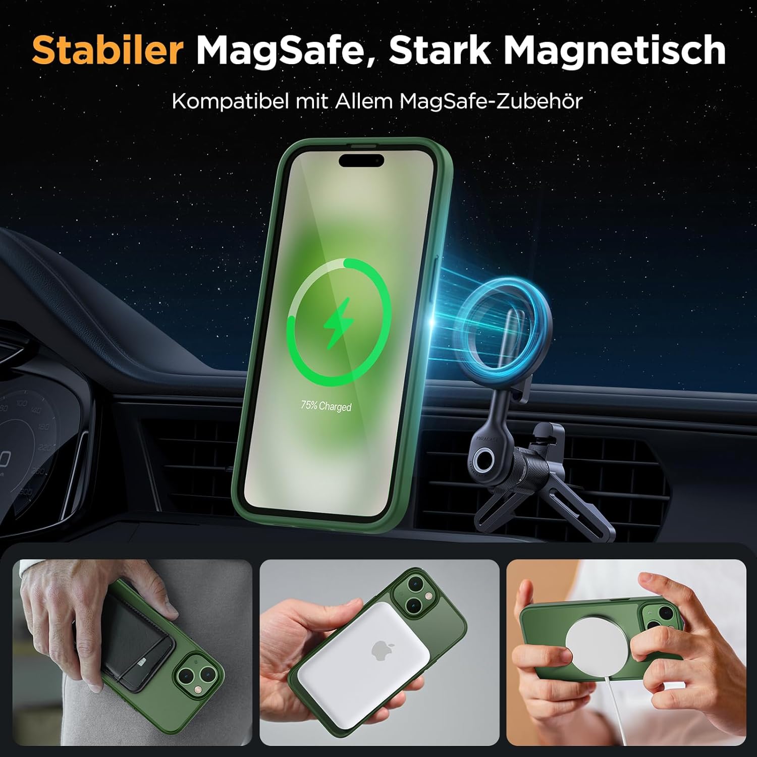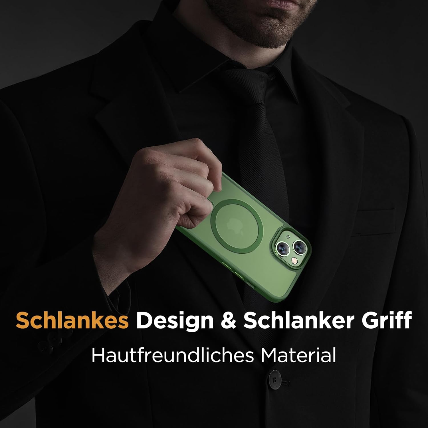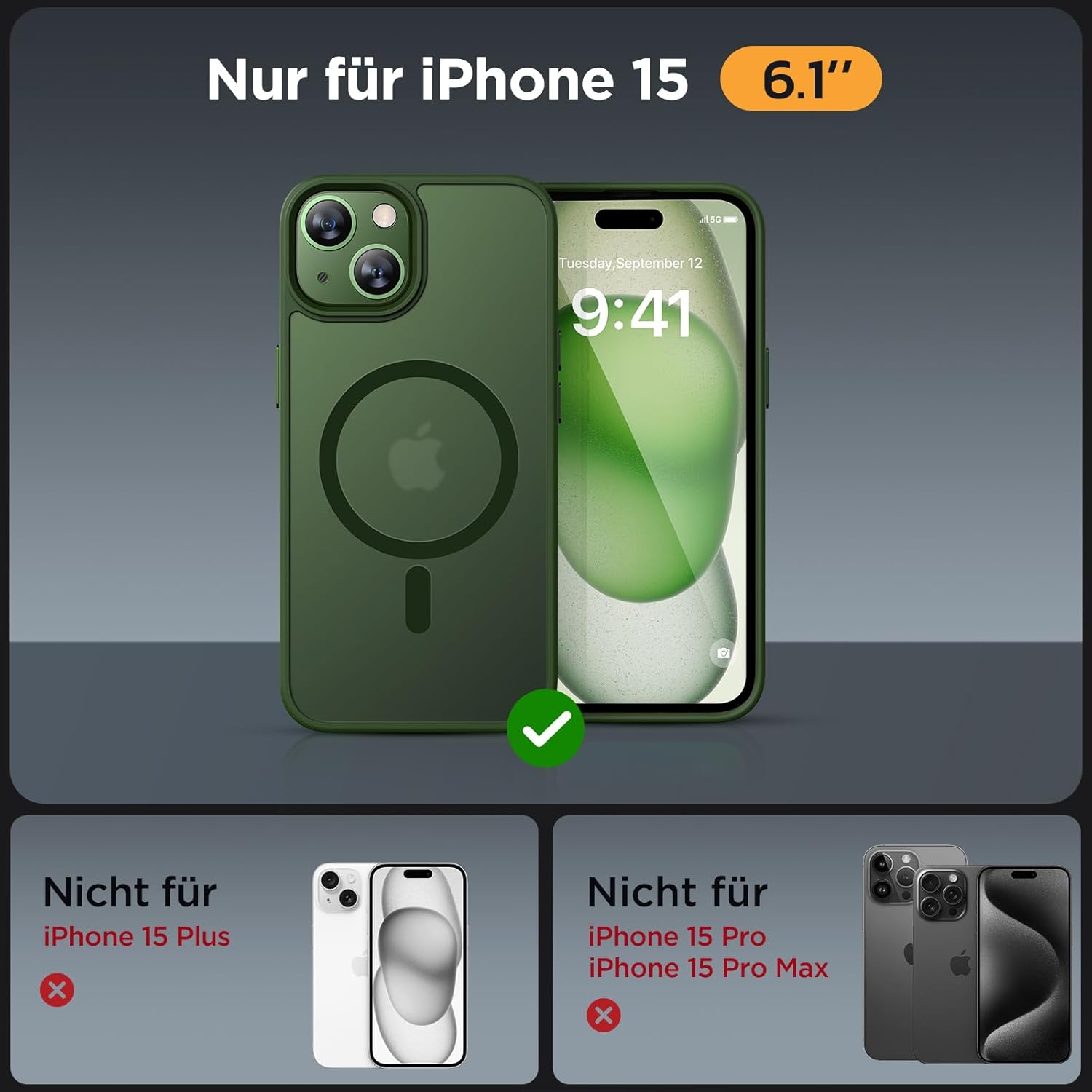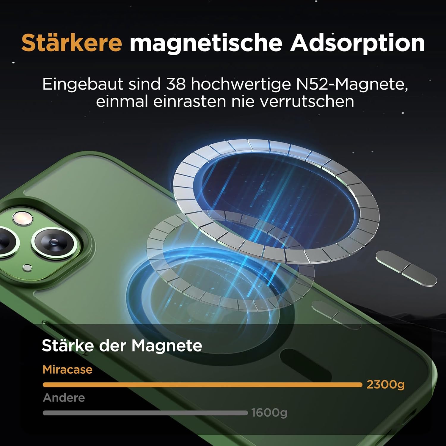 Miracase Magnetic Case за iPhone 15, съвместим с MagSafe [с 2 защитни стъкла], военен стандарт за защита, против пръстови отпечатъци, тънък дизайн, мобилен телефон за iPhone 15 6.1 инча, матово зелен