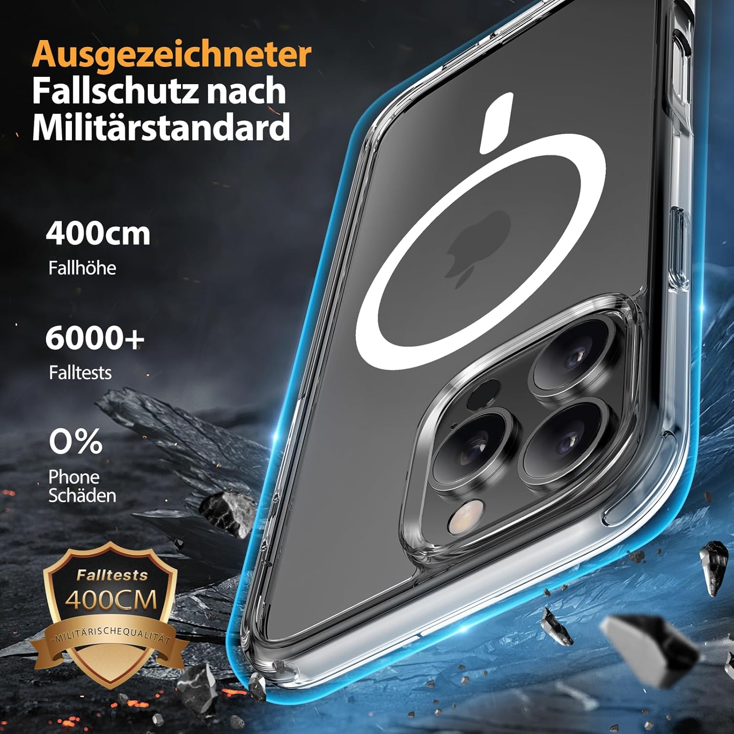 • Защита от падане от военен клас: Превишава военните стандарти MIL-STD-810G: Усъвършенствана технология за устойчивост на удари в четирите ъгъла, комбинирана с 360° въздушна възглавница отвътре и 3-слойна термопластична полиуретанова (TPU) подплата. Осигурява отлична защита срещу падания от височина до 4 метра – потвърдено от над 6500+ теста за падане в над 40 тестови среди.
