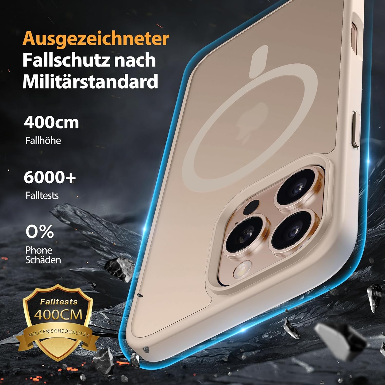 • Защита от падане от военен клас: Превишава военните стандарти MIL-STD-810G: Усъвършенствана технология за устойчивост на удари в четирите ъгъла, комбинирана с 360° въздушна възглавница отвътре и 3-слойна термопластична полиуретанова (TPU) подплата. Осигурява отлична защита срещу падания от височина до 4 метра – потвърдено от над 6500+ теста за падане в над 40 тестови среди.