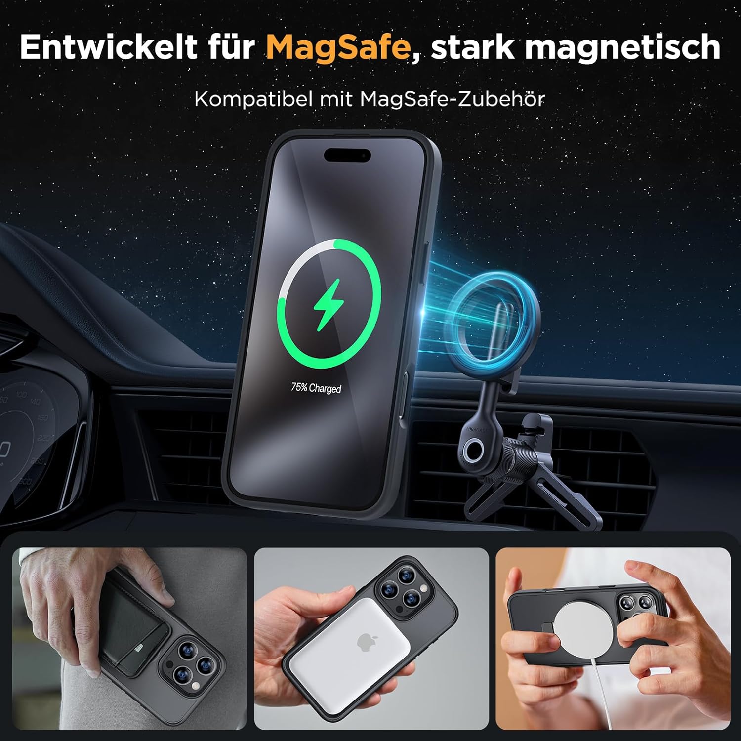 • Подобрена съвместимост с MagSafe: Специално проектиран калъф за iPhone 17 (6,3 инча): Интегрирана магнитна система 38 × N56+ с иновативен фокусен пръстен – 55% по-силно залепване от стандартните калъфи. Безпроблемно подравняване със зарядни устройства MagSafe за сигурно бързо зареждане от 25 W+, както и стабилно задържане на всички устройства MagSafe.