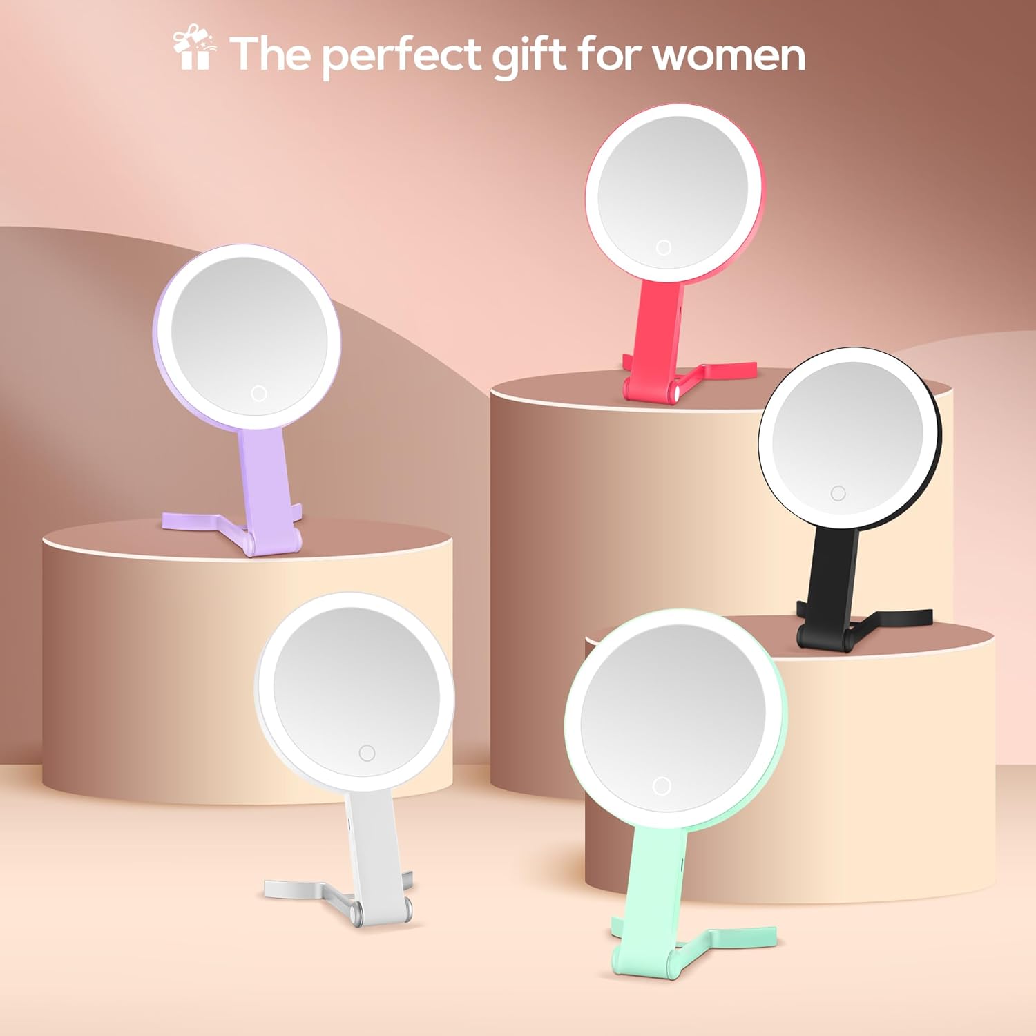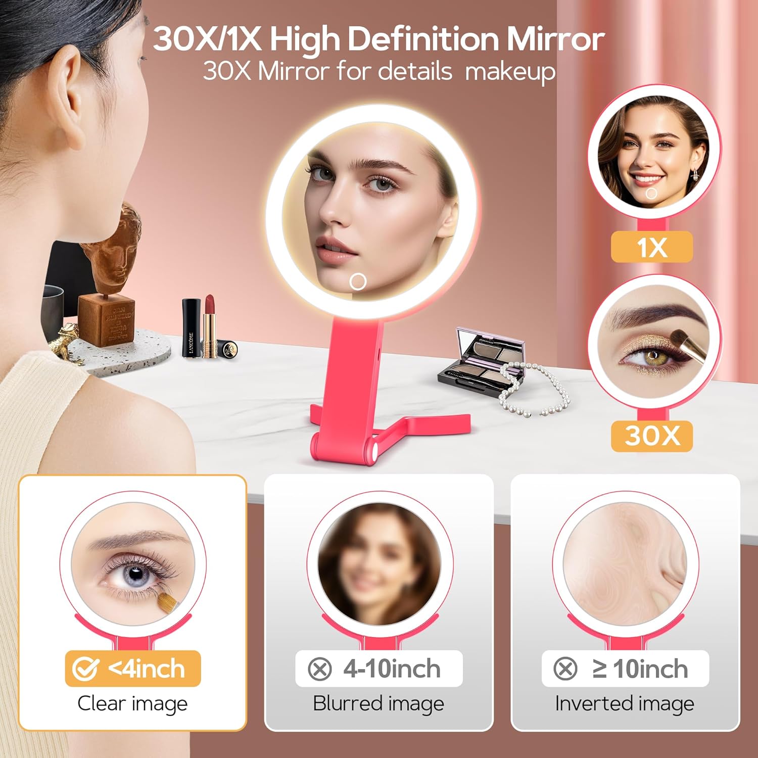 MIYADIVA Осветено огледало за грим, двустранна лупа 30X, 3 в 1 (ръчно/настолно/стенно), козметично огледало с 3 цветни светлини за пътуване, офис, спалня, подарък за жени, златисто