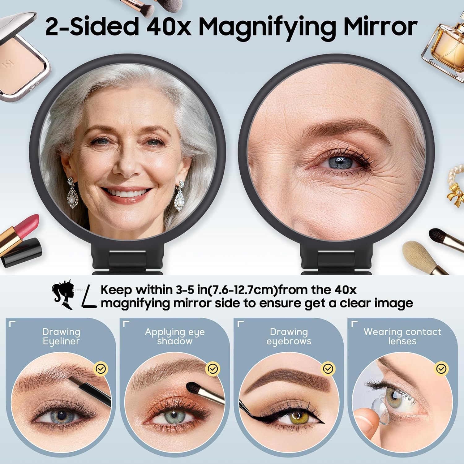 • ️30X Увеличаващо огледало: 30-кратното увеличение ще ви поднесе невъобразима изненада, то може да открие всички несъвършенства на очите и кожата на лицето ви и да ви помогне с почистване и ремонтни дейности. Например, при носене на контактни лещи, поставяне на изкуствени мигли, скубане на вежди и мустаци и други деликатни задачи.