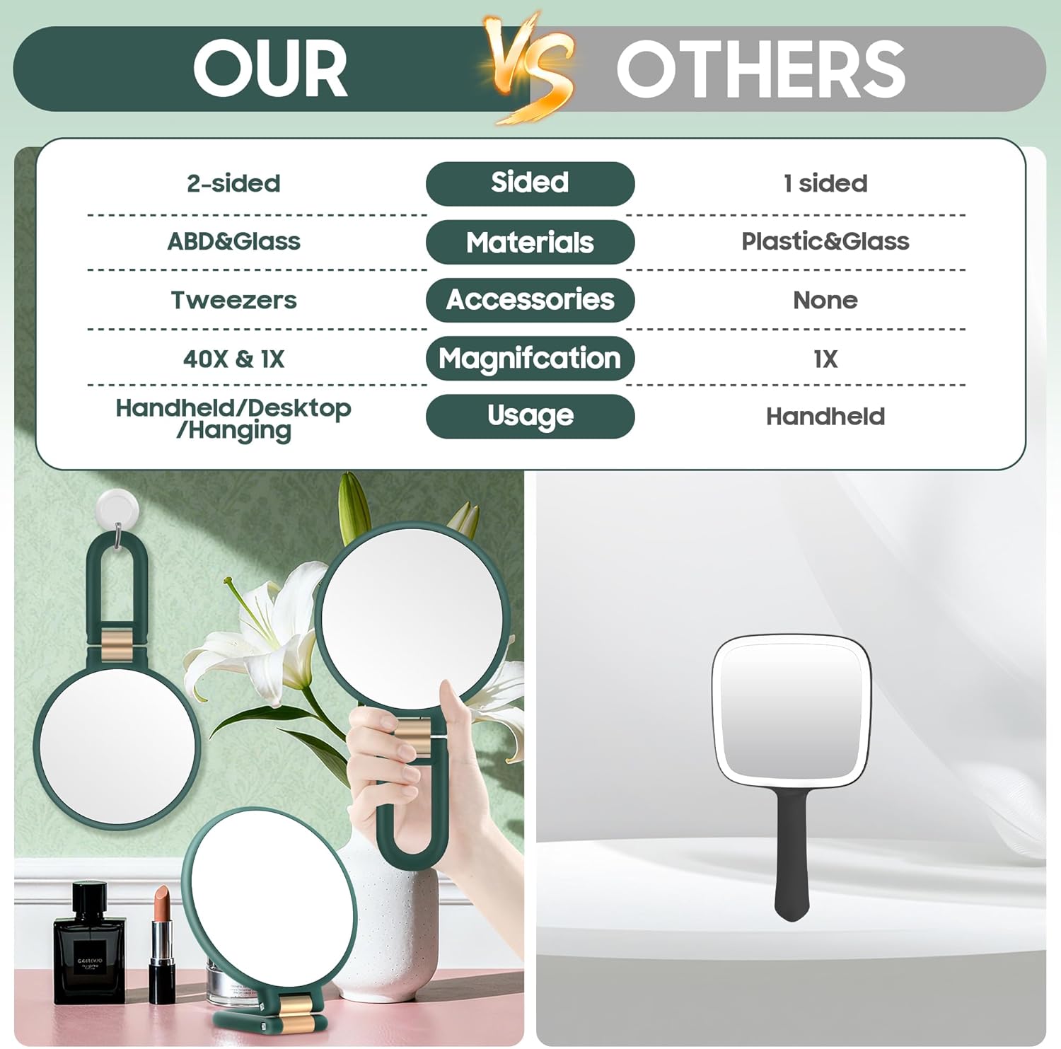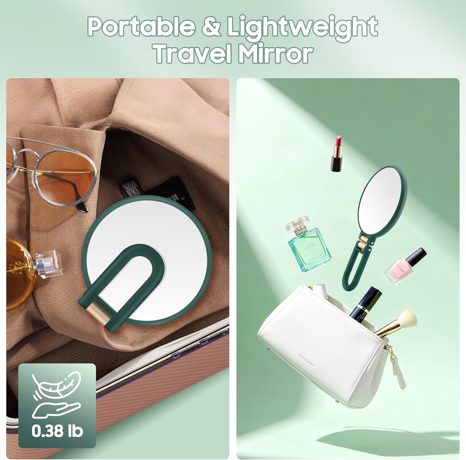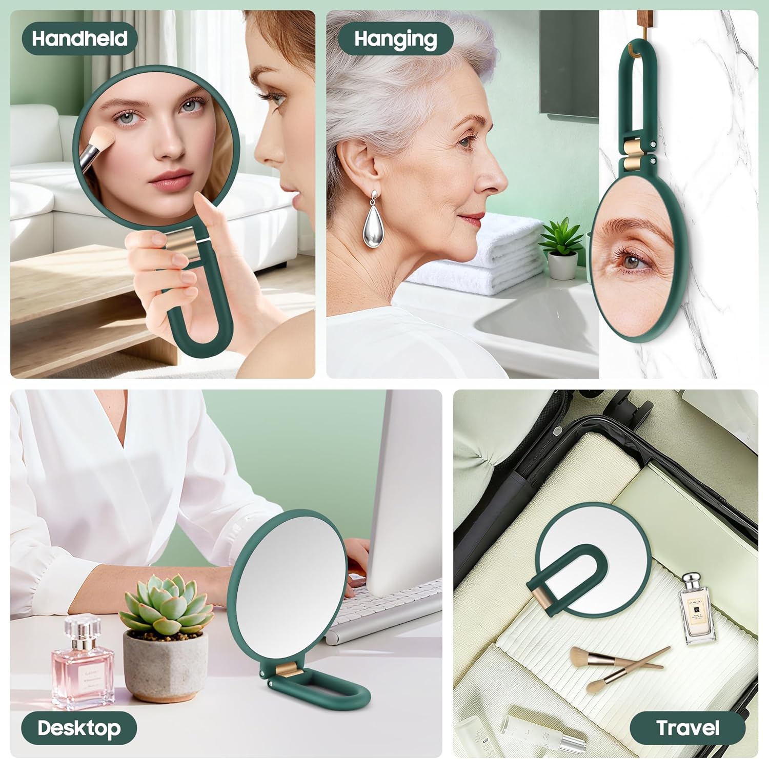 • ️360° въртящо се ръчно огледало: Това многофункционално ръчно огледало с дръжка разполага с гъвкава стойка, която се върти на 360 градуса и може да се регулира под различни ъгли, за да отговори на различните ни нужди. В зависимост от сценария на употреба, може да се използва и като ръчно огледало, настолно огледало и висящо огледало.
