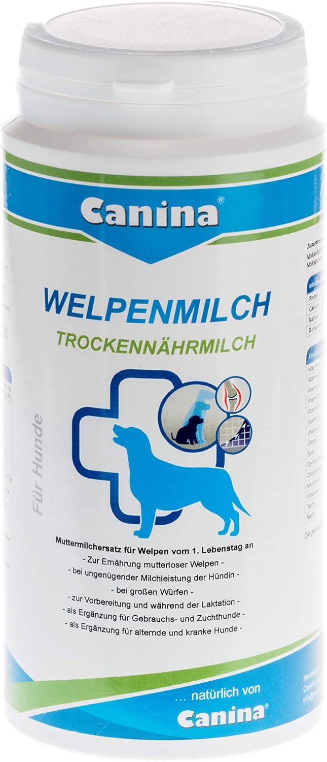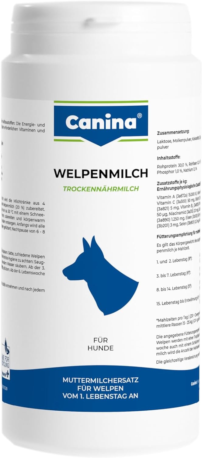 Разбъркайте млякото с тел при приблизително 35°C. Пригответе 1 част мляко за кученца и 4 части вода (1:4) отделно за всеки ден. Хранете по следния график: Седмица от живота Хранения на ден Малки породи Средни породи на всеки 2 часа 10 пъти, от които 3 x 0,5 1,5 2 на всеки 2 часа през нощта 10 пъти 1,5 2 3 на всеки 2-3 часа 8 пъти 1,5 2 3 на всеки 2-3 часа 8 пъти 3 6 10 5-8 5 пъти Регулирайте количеството импрегнация според нуждите на кученцето. От 3-та до 4-та седмица, бавно давайте кашата Caninas puppy gruel, като поддържате същото количество мляко за кученца. Едва от 6-та седмица нататък количеството мляко за кученца трябва да се намали. Съхранявайте на сухо място и не над 25°C; изваждайте с чиста лъжица и внимателно затваряйте след всяка употреба.