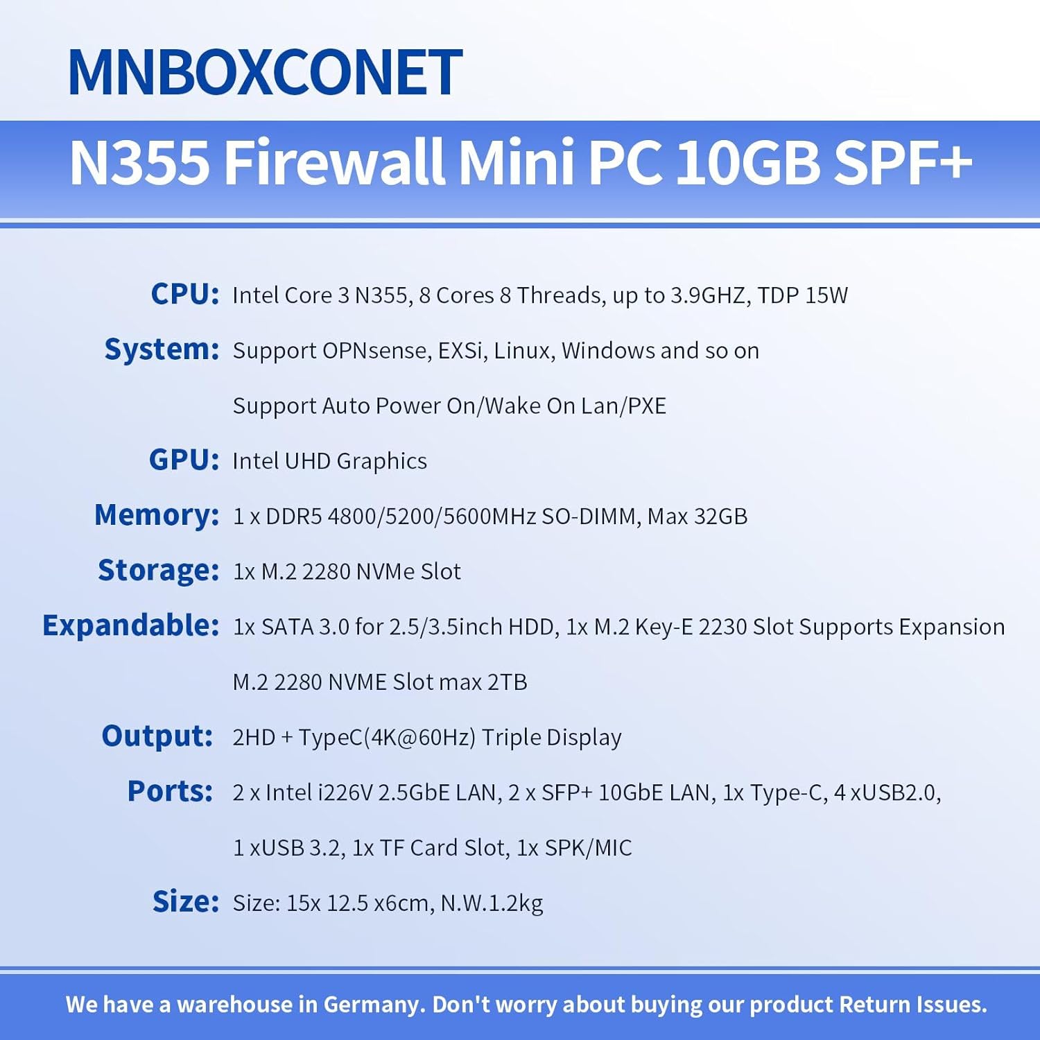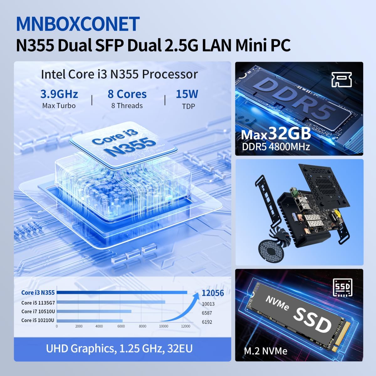 MNBOXCONET S2 Мини компютър N355 2x10gb SFP+, хардуер за защитна стена, микро офис, Barebone без RAM без SSD, 2x226V 2.5Gbit LAN, USB C, слот за TF карта, поддръжка на Proxmox OPNsense Win, SPK/MIC