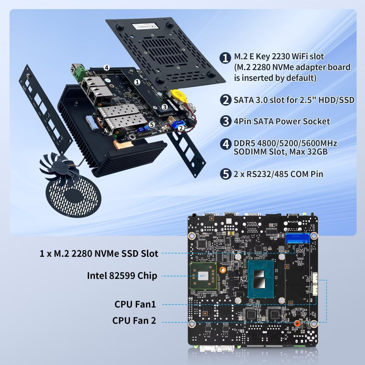 • Мини компютър 10 Gigabit Ethernet 82599ES SFP Firewall с 1 x LPDDR5 RAM 4800MHz, съвместим с 5200/5600MHz, макс. 32G. 1 x M.2 2280 NVMe SSD слот, макс. 2T. Малък офис компютър с две SPF+ 10GBE мрежови карти, 2 x i226V 2.5GB мрежови карти с пълен UDE2.5G чип и филтърен конектор. 2-пиново захранване. Натиснете "Delete" или "F7", за да влезете в UEFI BIOS.