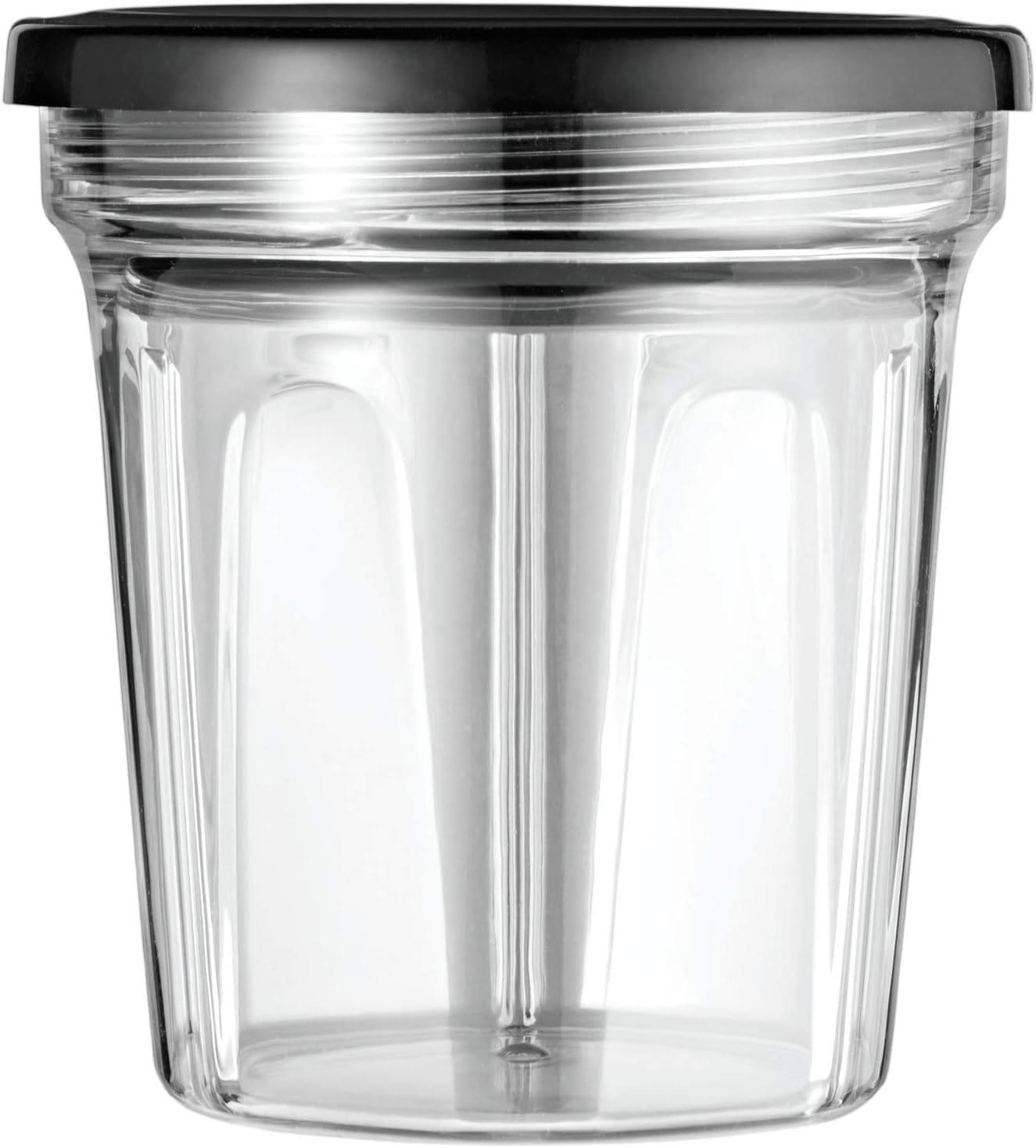 All shatter proof Tritan plastic shakers can be cleaned in the dishwasher. The 1.2 litre mixing jug has a refill opening and dosing cup in the lid. The handle cover can be removed for cleaning. The 2 large mixing containers can also be used as a drinking bottle after mixing. The small 0.3 litre container is suitable for grinding/chopping harder ingredients, such as coffee beans, nuts and cereals.