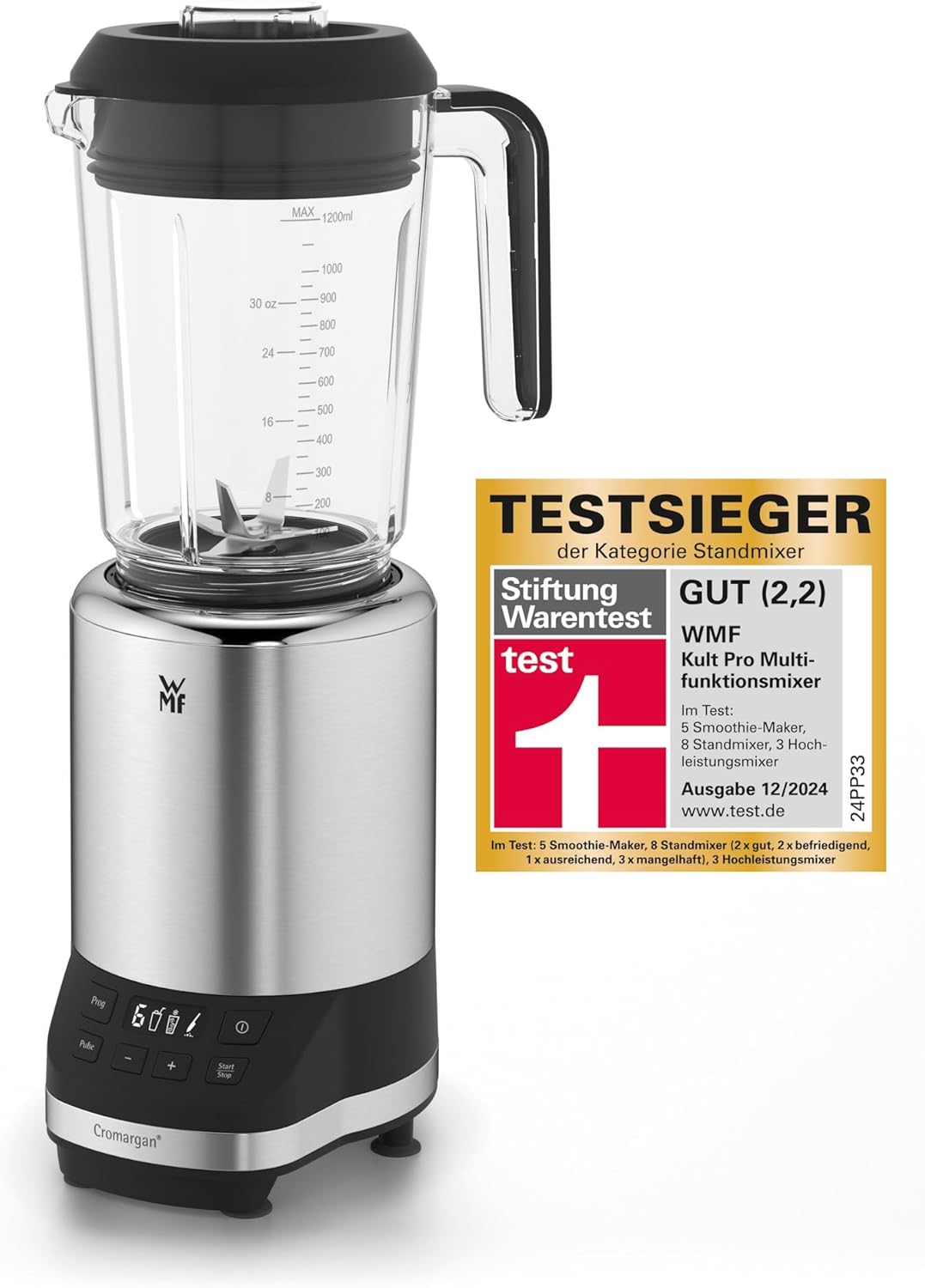 Класа сама по себе си е този високопроизводителен миксер с мощност 1200 вата, шест степени на скорост и цифров LCD дисплей. Многофункционалният миксер WMF Kult Pro нарязва, кълца, смила, смесва, разбърква, настъргва и пюрира всичко с едно натискане на бутон. Три автоматични програми приготвят смутита, натрошен лед, прясно смляно кафе на прах и, разбира се, много други. Особено полезен за „из път“: Два капака, устойчиви на протичане, правят контейнера за смесване преносим. Богатата гама от аксесоари е подходяща и за съдомиялна машина. Разбърквайте, мелете и нарязвайте като професионалисти.