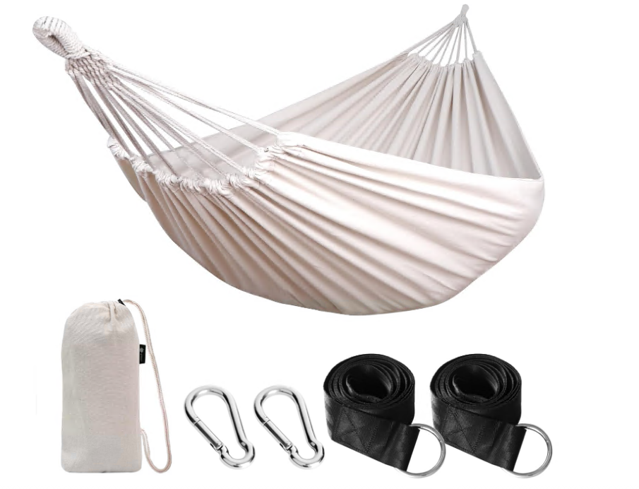 Бързо: Сглобяването на този памучен хамак отнема около две минути. Включва 2 карабинера и 2 черни, широки каишки със стоманени халки в единия край. Можете да прикрепите хамака към стойка за хамак или да го окачите на дървета. Ще се насладите на свободата, която ви дава стойката, като можете бързо да разположите хамака си на желаното място.