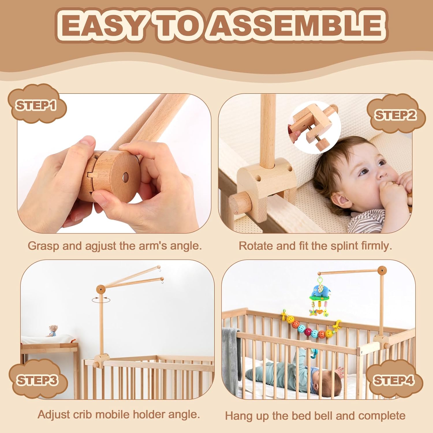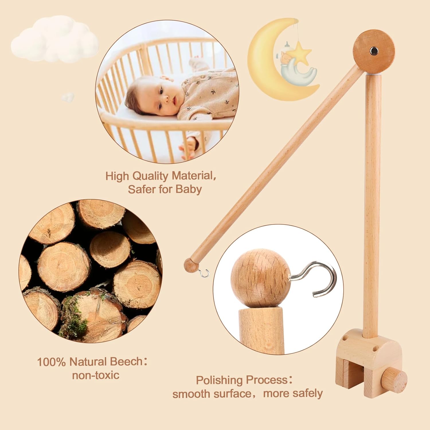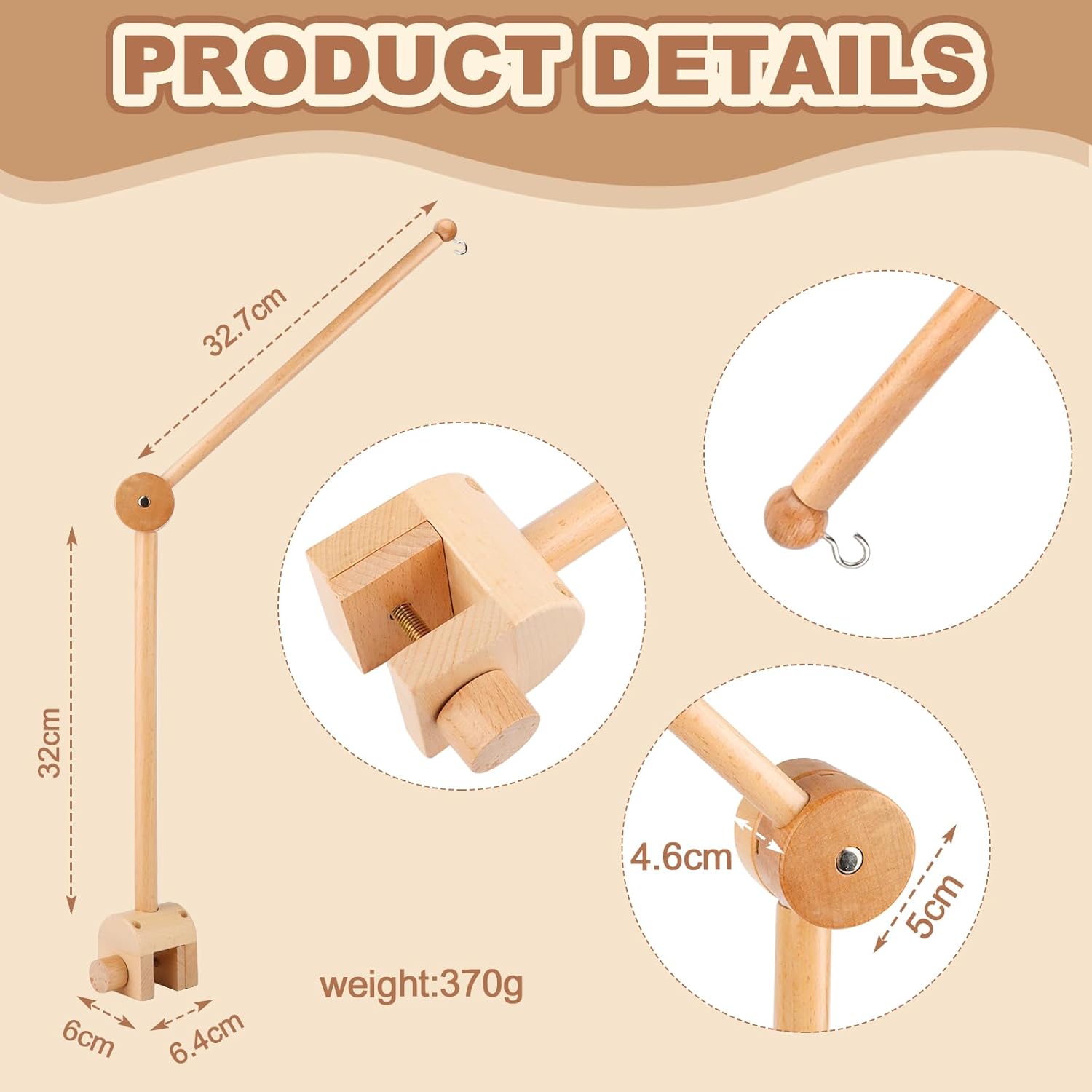 Този ръчно изработен мобил с държач, изработен от естествено дърво, предлага минималистичен дизайн, като същевременно гарантира безопасна и издръжлива употреба. Дървеният мобил за бебета е подходящ за повечето детски легла и създава интерактивна среда, която насърчава сензорното и когнитивното развитие на вашето бебе.