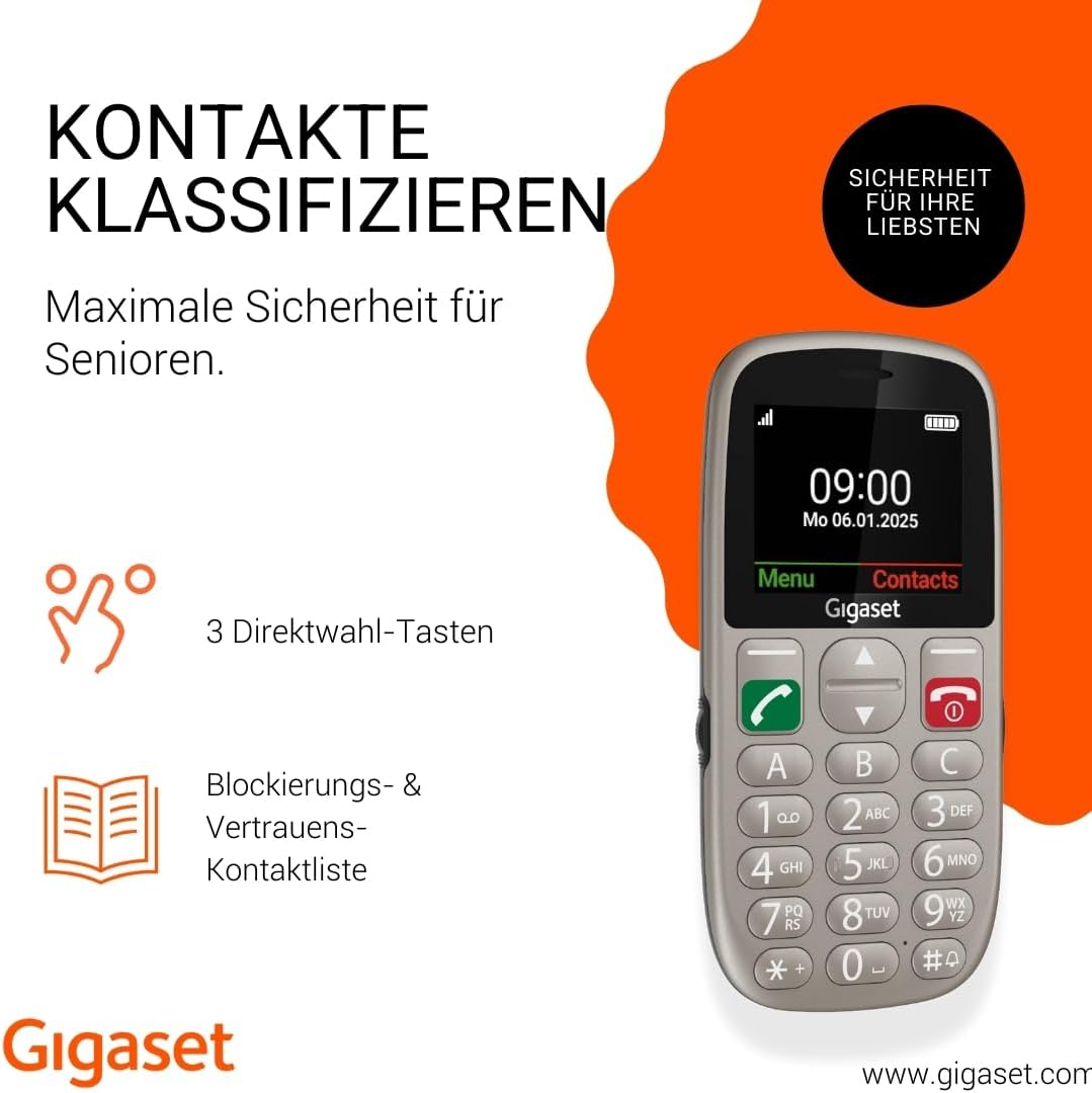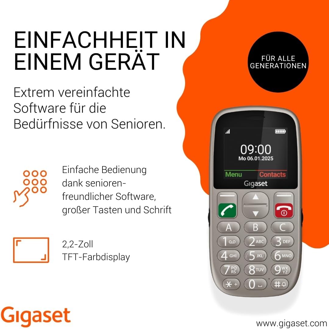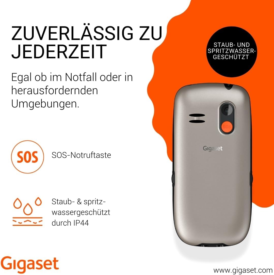 Мобилен телефон Gigaset GL395 - Лесен за работа за възрастни хора, големи бутони и бутон за спешни случаи SOS - Защита от прах и водни пръски, клас на защита IP44 - Без договор - 2.2-инчов TFT цветен дисплей, титаниев цвят