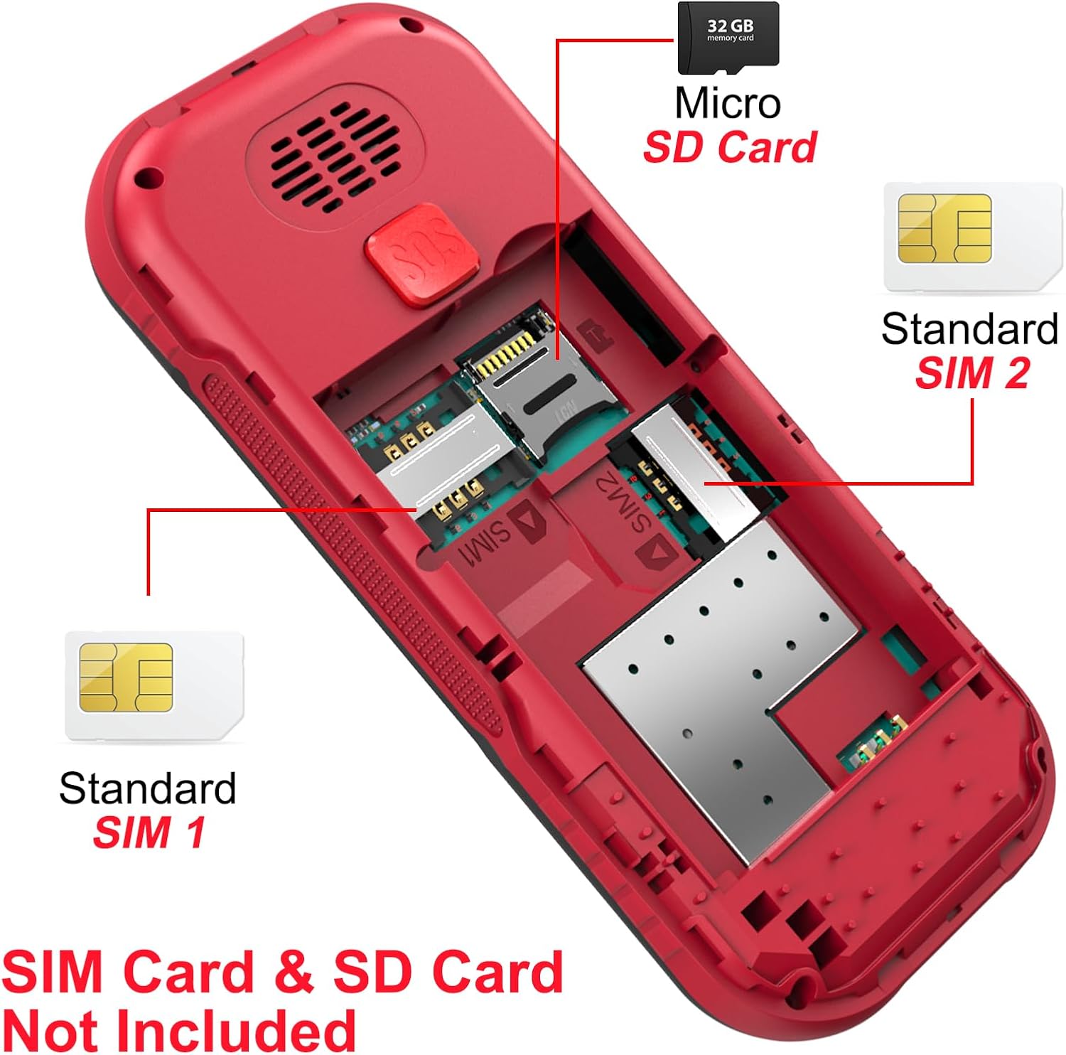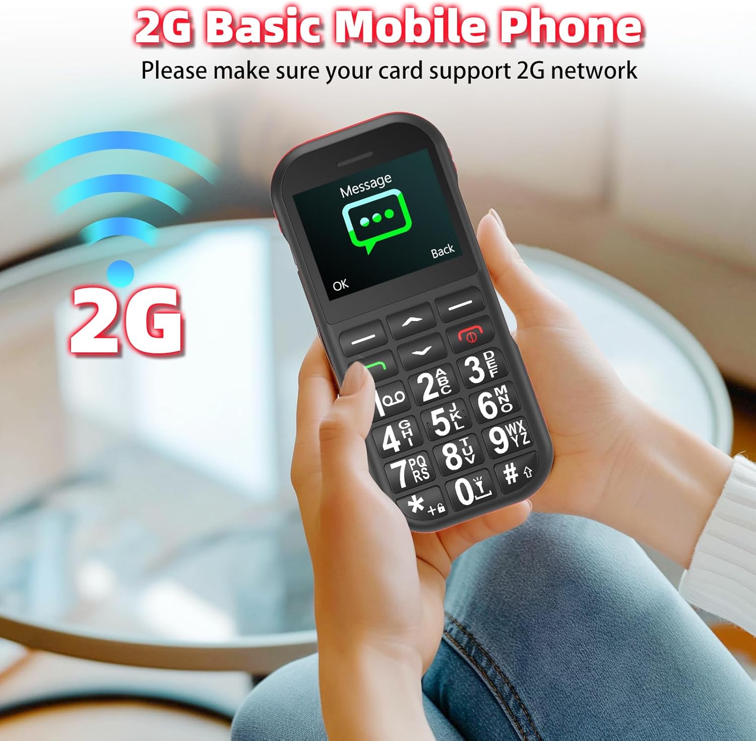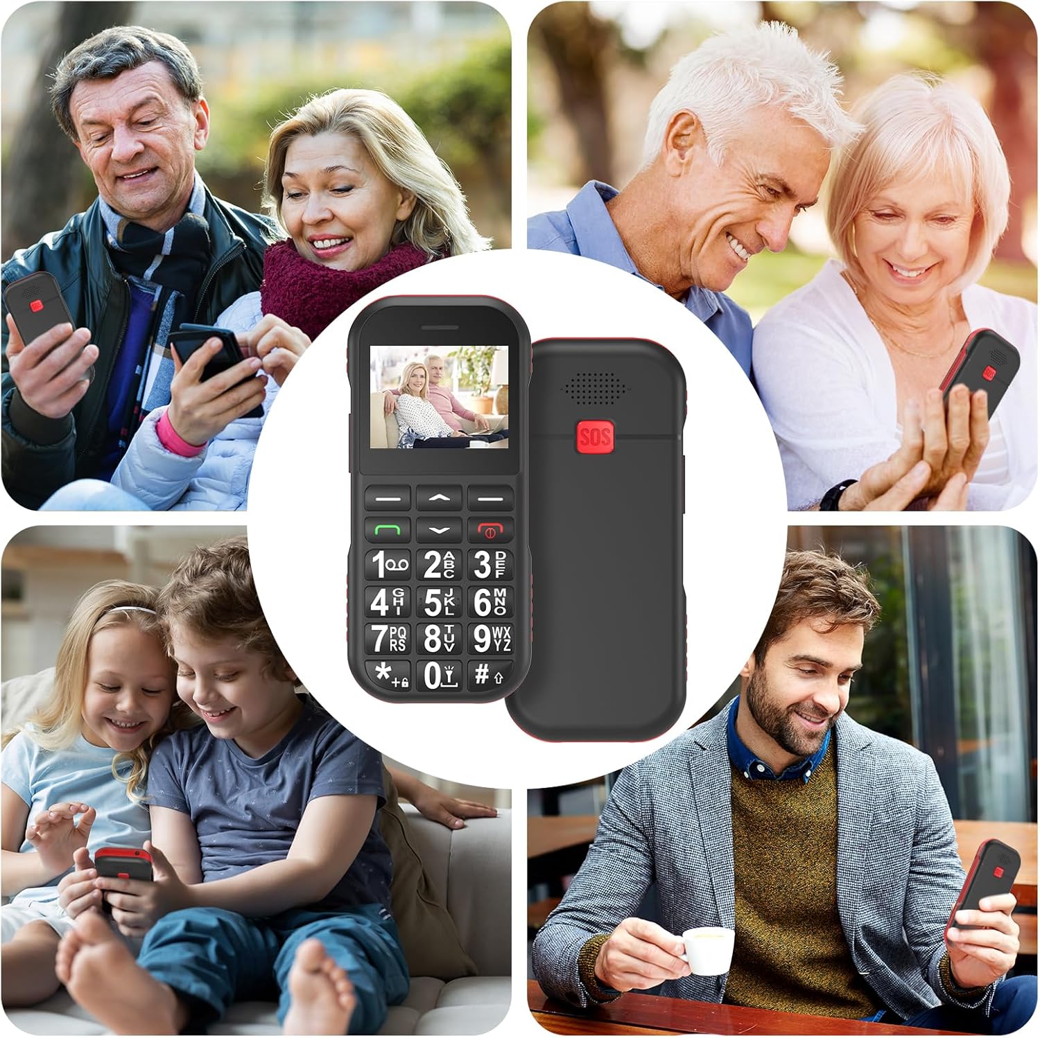 GSM мобилен телефон за възрастни хора: Този обикновен GSM мобилен телефон без договор (не е интелигентен мобилен телефон) е само 2G (не 3G/4G мрежа). Основната му функция е да осъществява повиквания. При мобилните телефони за възрастни хора сложните функции са умишлено пропуснати, за да се улесни работата от възрастни хора/деца.