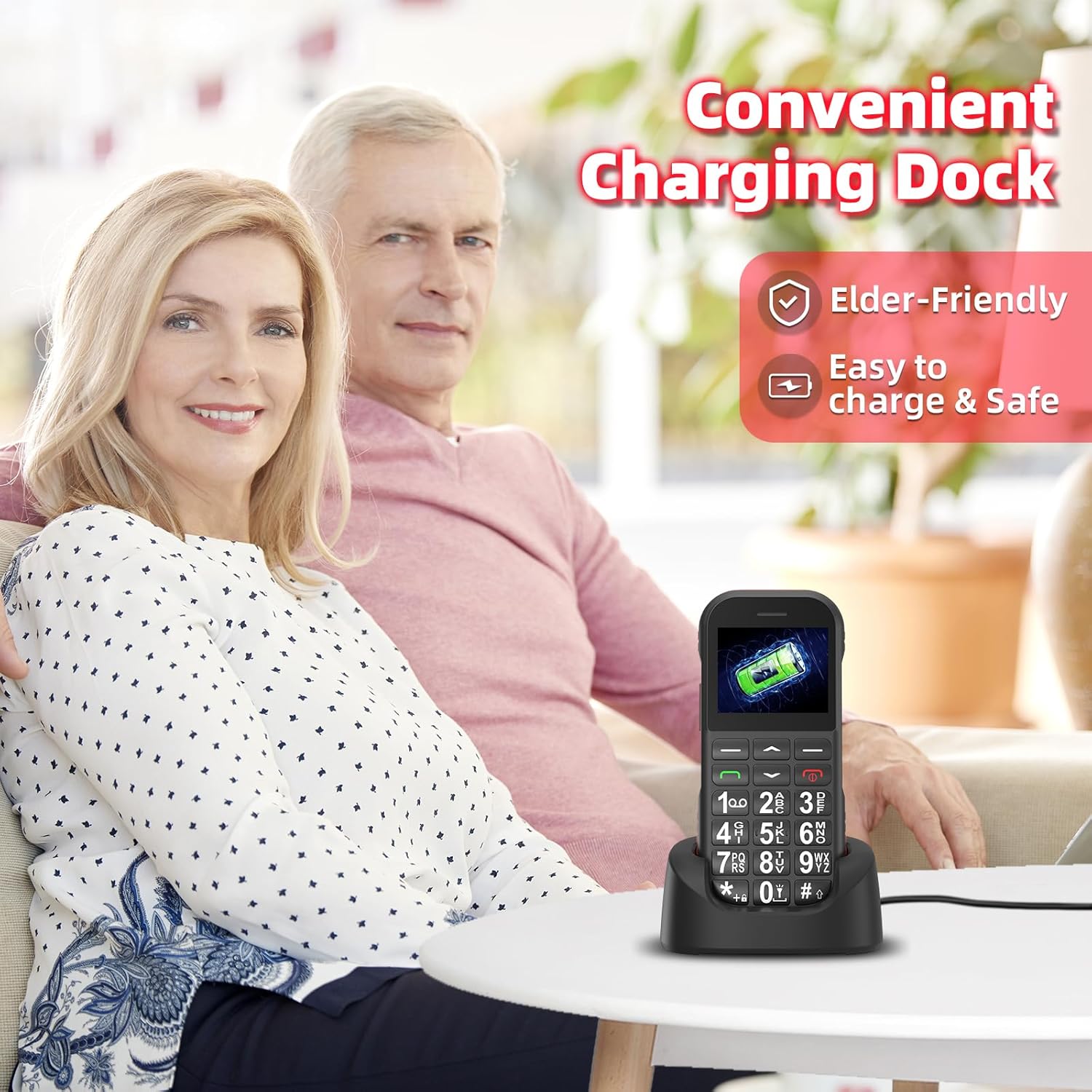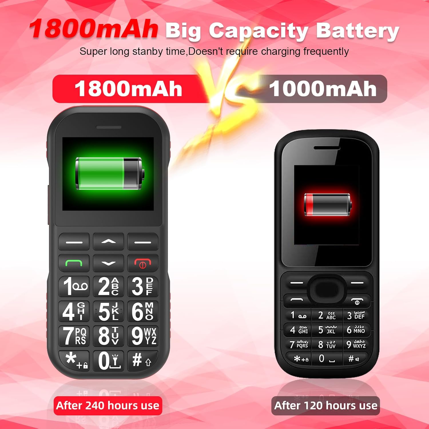 1800 mAh battery with long service life: 1800 mAh battery capacity is higher than similar products, continuous talk time up to 6-7 hours, standby time up to 300-360 hours (12-14 days), long service life. It is also equipped with a charging station, you just need to slide the mobile phone into the docking station and it will automatically charge.